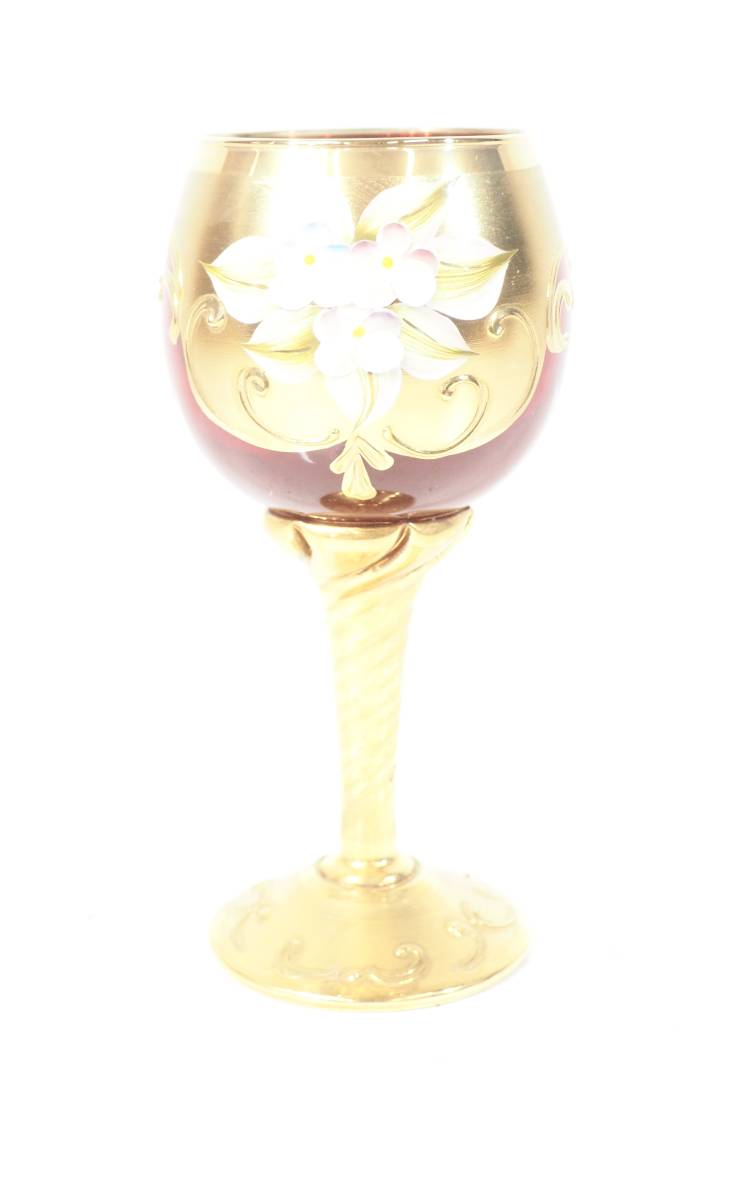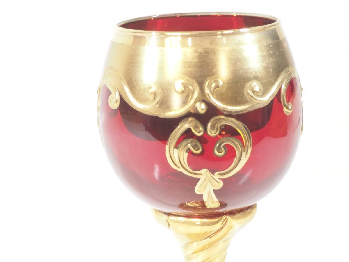 イタリア ビンテージ ムラノ エナメル花絵付ワイングラス ベネチアングラス 花盛金彩赤硝子 1980年代 直径5.5cm 口径5cm 高さ13.5cm YTK507