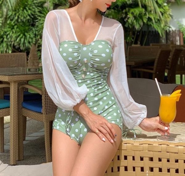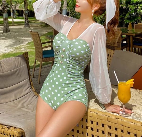 【イチオシ厳選商品】 レディース 水着 ワンピース パフスリーブ ドット柄 ハイウエスト h29