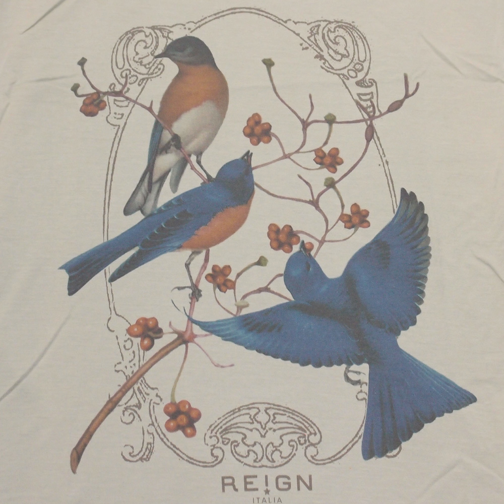 落ち着いた色合いに鳥のプリントがナチュラルでカジュアルな印象。