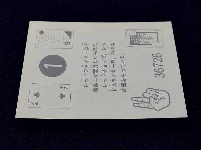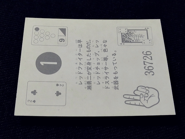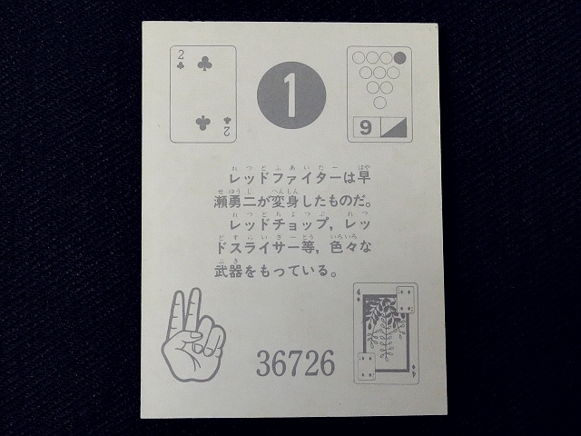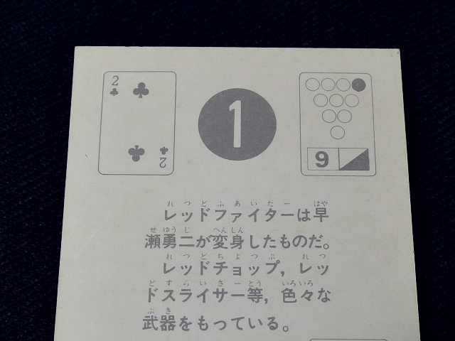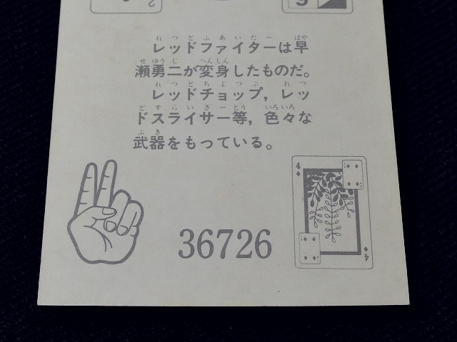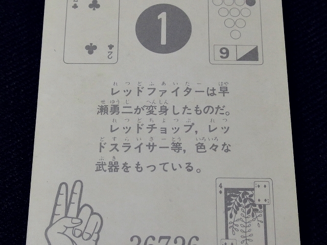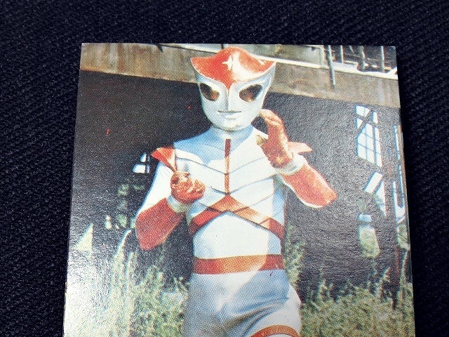 ミニカード トリプルファイター ・ブルマァク製 ・(1弾:全32種シリーズ1-32) ・(2弾:欠番有の可能性有り、18種まで確認。33-54) ・サイズ:6.5cmx5.0cm ・販売:1972年 ・中古扱い ・同梱発送可能(複数落札の場合:定形、定形外郵便は、送料が変わる場合があります。) 〓参考項目〓 ・制作:円谷プロダクション ・放送期間1972年7月3日 - 12月29日 ・全130話 〓キャスト〓 ・早瀬哲夫 / グリーンファイター(声):滝沢浩 ・早瀬勇二 / レッドファイター(声):小野川公三郎 ・早瀬ユリ / オレンジファイター(声):笛真弓 ・大野あつし:石井秀人 ・ブルコンの声:石山克己 ・怪人の声:辻しげる、上田侑嗣 ・デーモンの声:武田昌之 ・ナレーター:村越伊知郎 〓スーツアクター〓 ・グリーンファイター:荻原紀 ・レッドファイター:戸知章二 ・オレンジファイター:車邦秀 ・トリプルファイター:吉中正一
