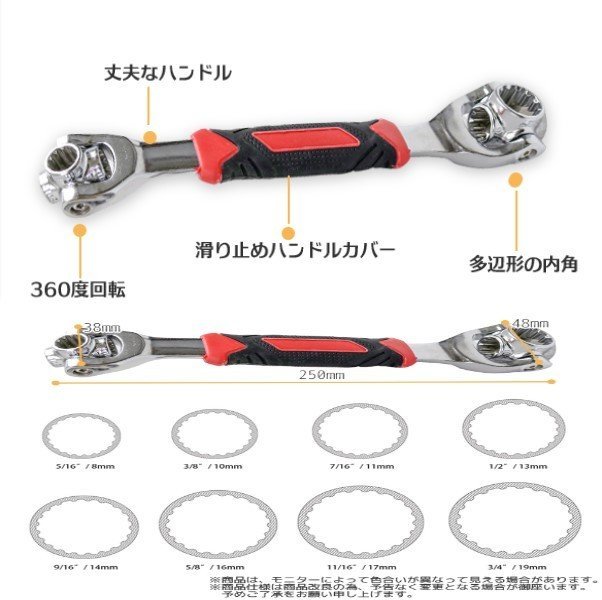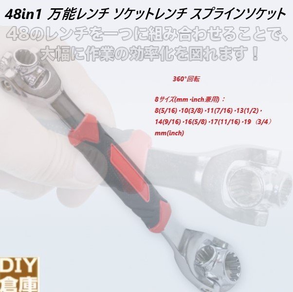 | 商品の詳細 | ★★ 48 in 1ソケットレンチ: 複数のレンチや大げさなツールキットはもう必要ありません。 48のレンチを一つに組み合わせることで、大幅に作業の効率化を図れます。 多種類のボルト&ナットに対応: 六角ミリ・インチ、ヘクスローブ、スプライン、四角、角の潰れたボルト・ナットの締付け・緩めに! 仕様: 8サイズ(mm・inch兼用): 8(5/16)・10(3/8)・11(7/16)・13(1/2)・14(9/16)・16(5/8)・17(11/16)・19(3/4)mm(inch) 360°回転: ヘッド部分が回転するので、作業しづらい箇所に適しています。 機械修理、自動車修理、家庭のメンテナンス、個人修理などに最適です。 | |