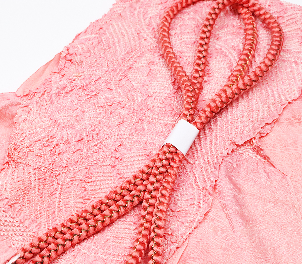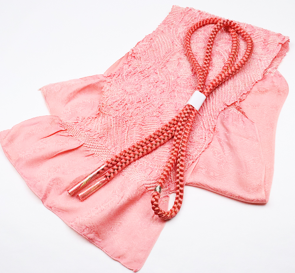 | 振袖用 絞り帯揚げと帯締めのセット 帯揚げ 濃いピンク地絞り花 帯締め 組紐 丸 薄赤色・金の編み 未使用品 | |