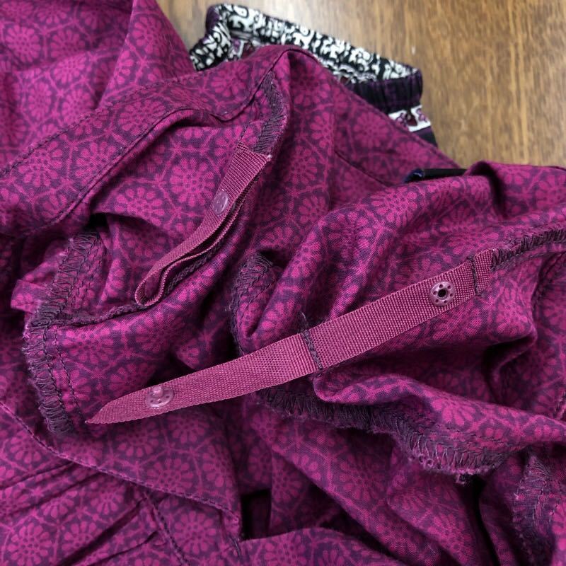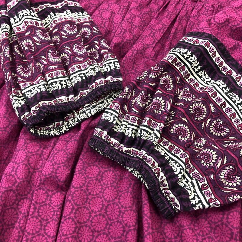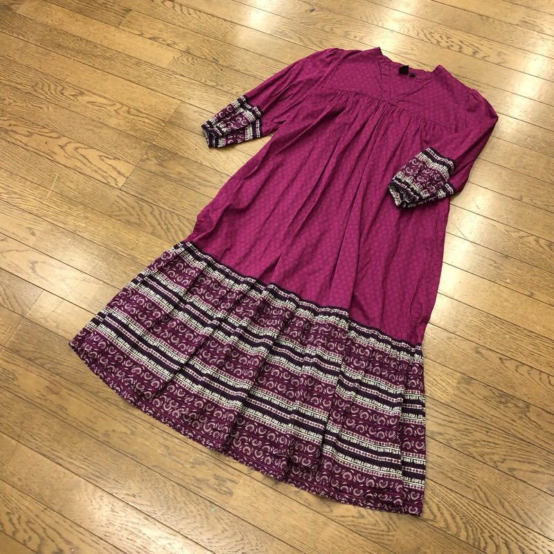 【その他】レディース、コットンワンピース、ブランドワンピース、ロング丈ワンピース、総柄、オープンカラー、内側両肩にインナー固定する紐あり、袖口ゴム、ギャザー入り、綿100%の薄い生地です。
