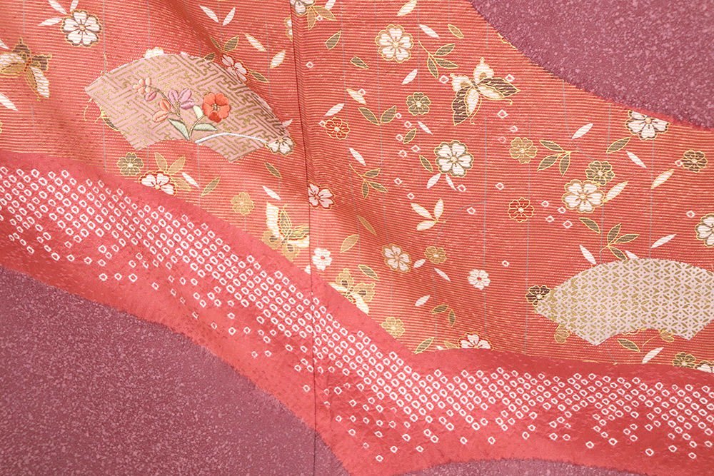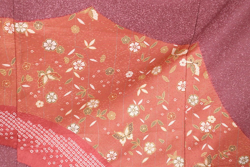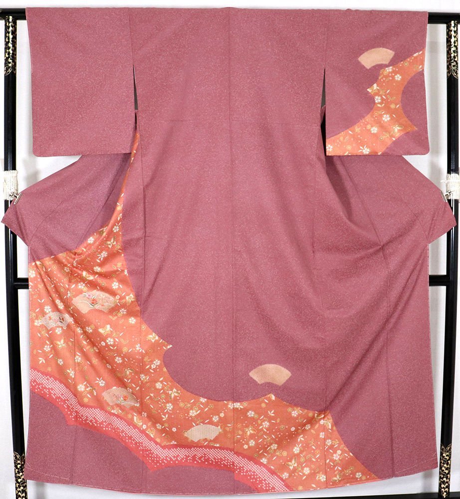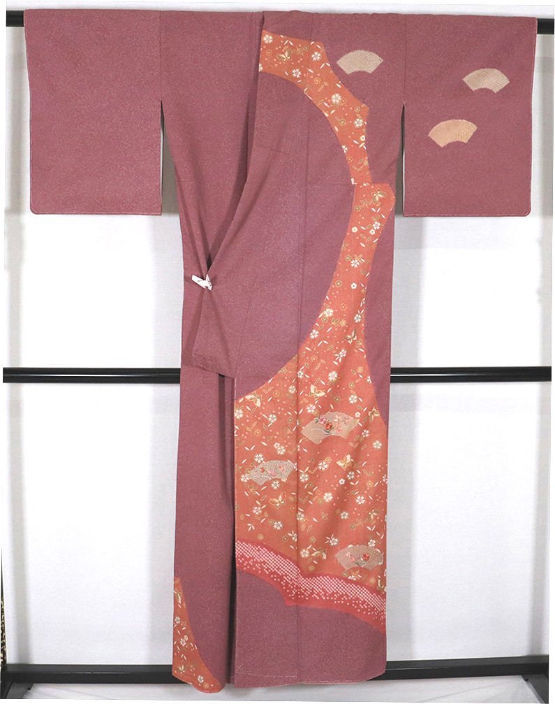 訪問着 袷 丹後縮緬地 赤紫・時雨模様地 絞り流水・扇 蝶・桜 刺繍草花 (写真では上手く色が出ない場合があります。ご了承下さい) |