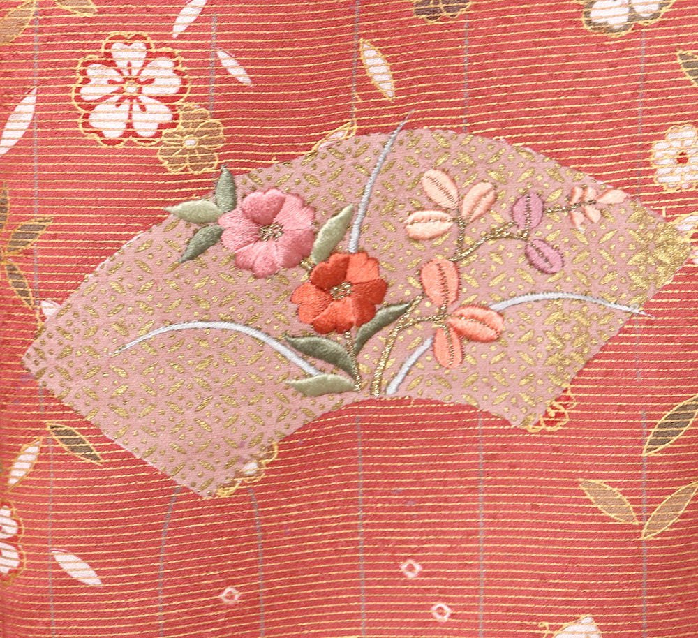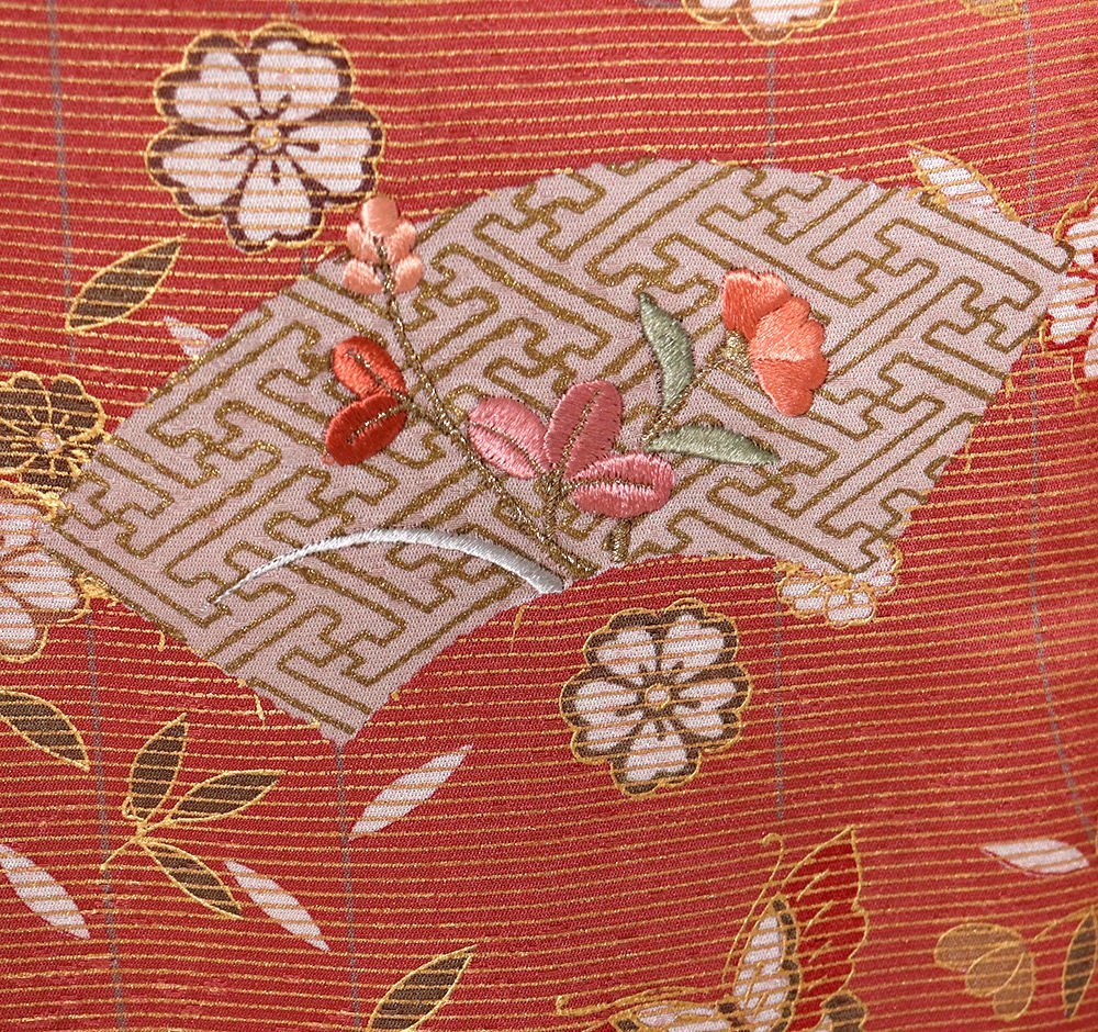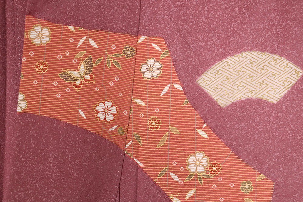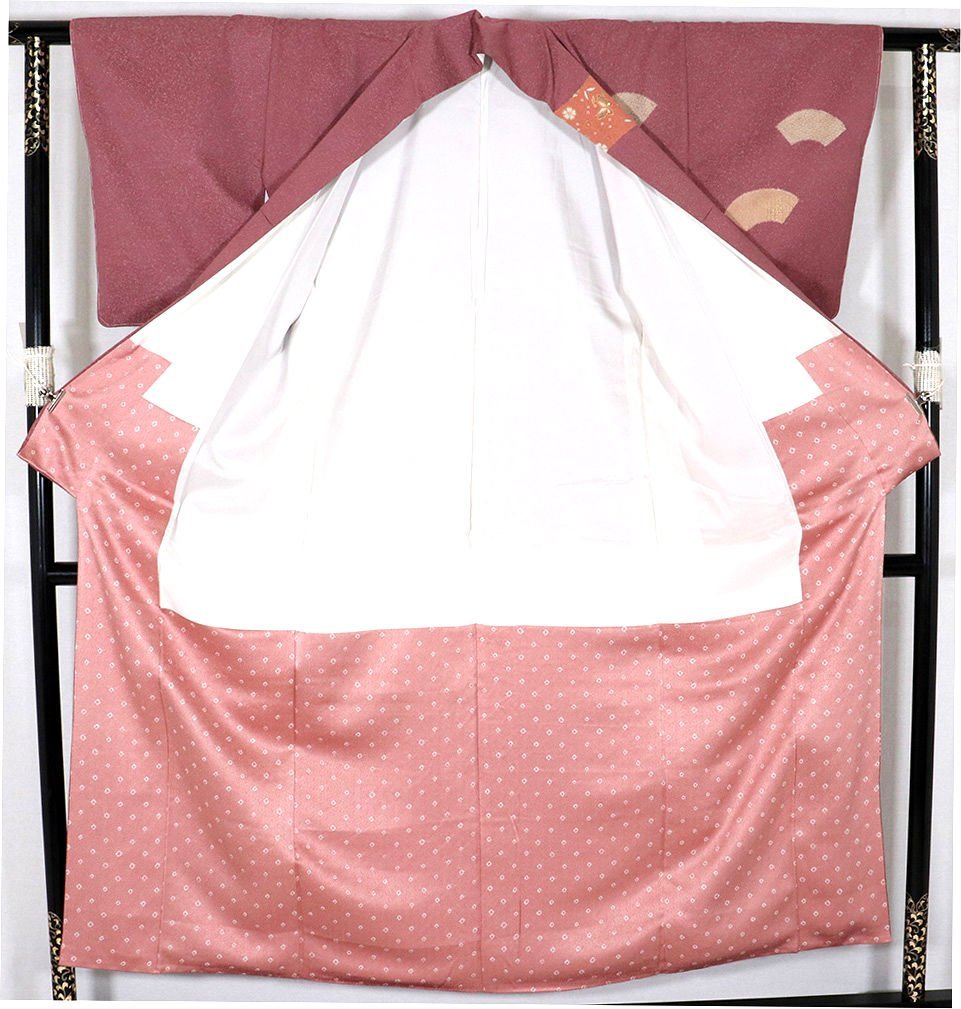 訪問着 袷 丹後縮緬地 赤紫・時雨模様地 絞り流水・扇 蝶・桜 刺繍草花 (写真では上手く色が出ない場合があります。ご了承下さい) |