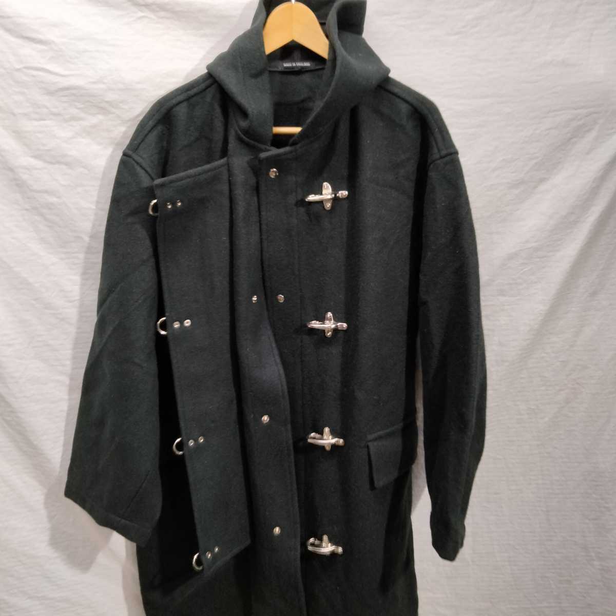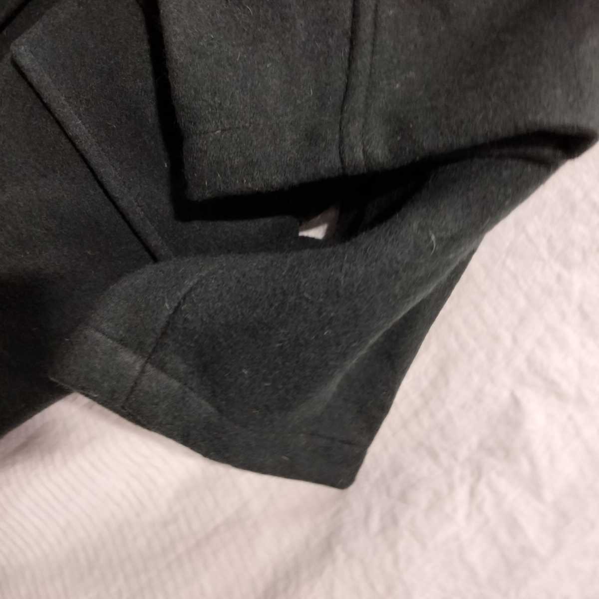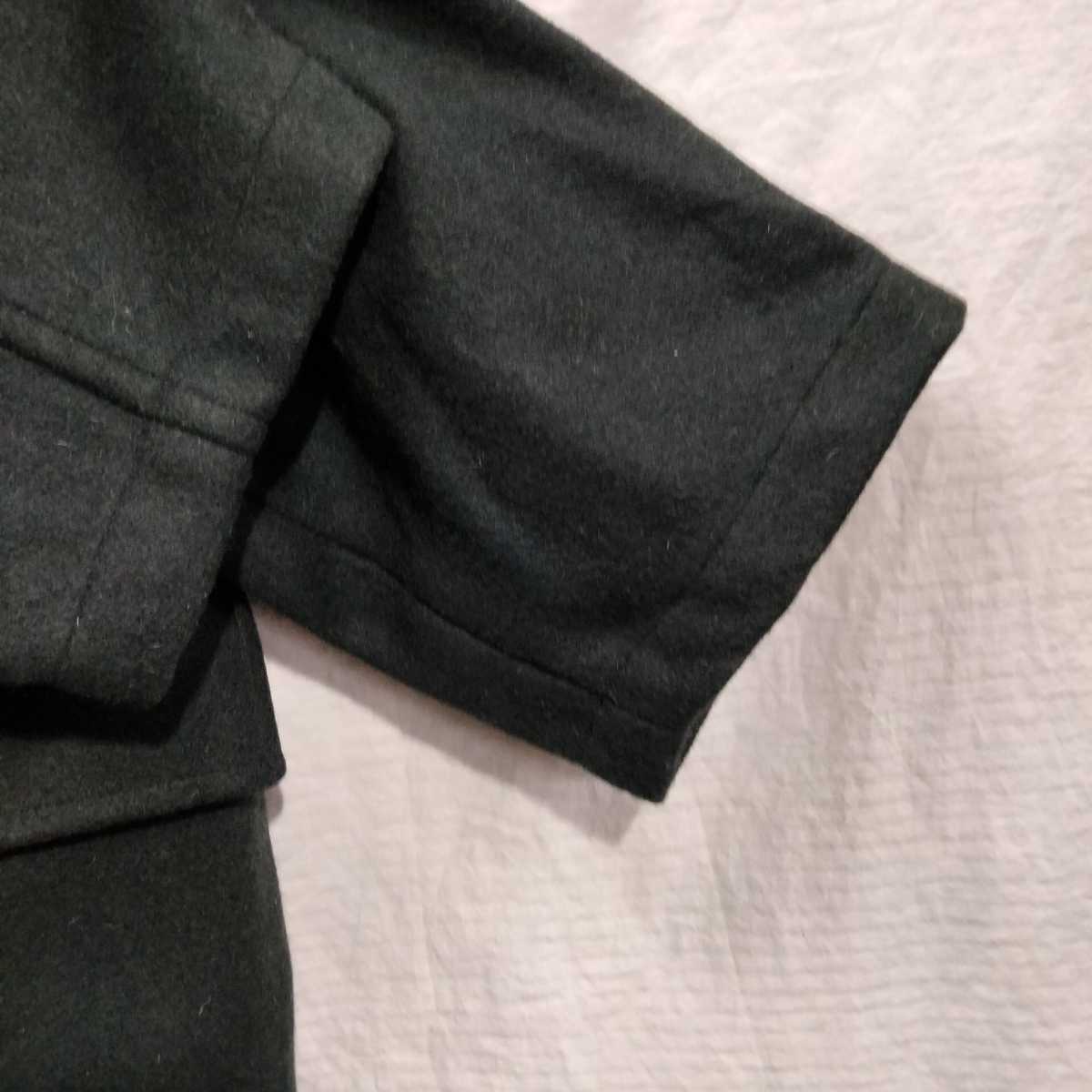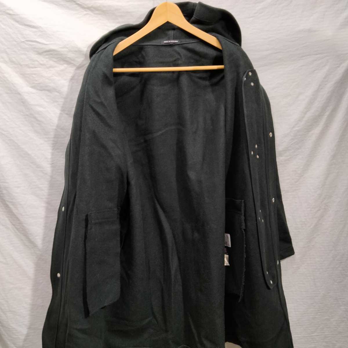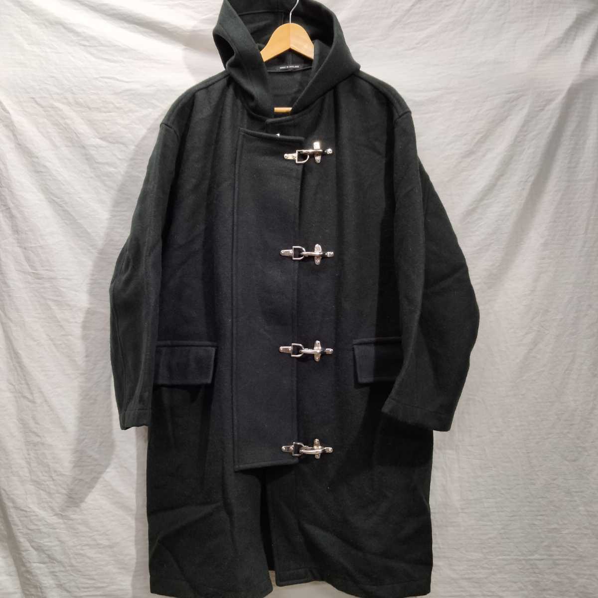 メルトン素材で脇背中などで、生地切り返しなく一枚生地で構築。フードは、左右2枚ハギ。フロント4つスナップボタン、その上に右側から被さるフラップに接続された、金具フックパーツで留める、ファイヤーマンコートフロント。左右フラップポケット。内袋式。裏起毛のない一枚生地。内側バイアスカバー縫製で、幅狭縫製。