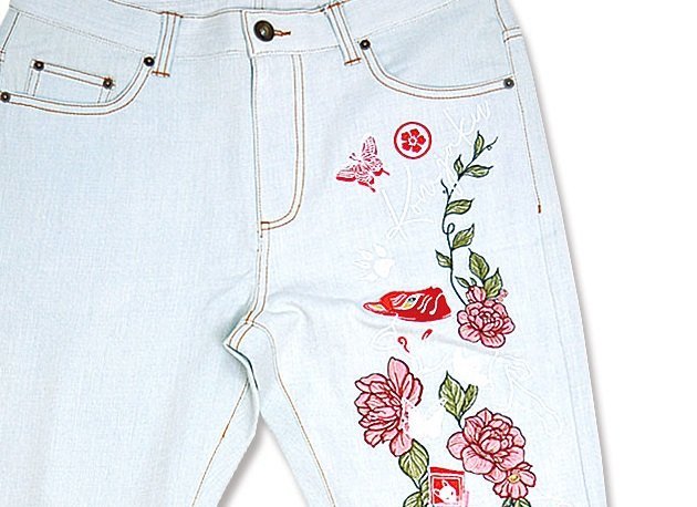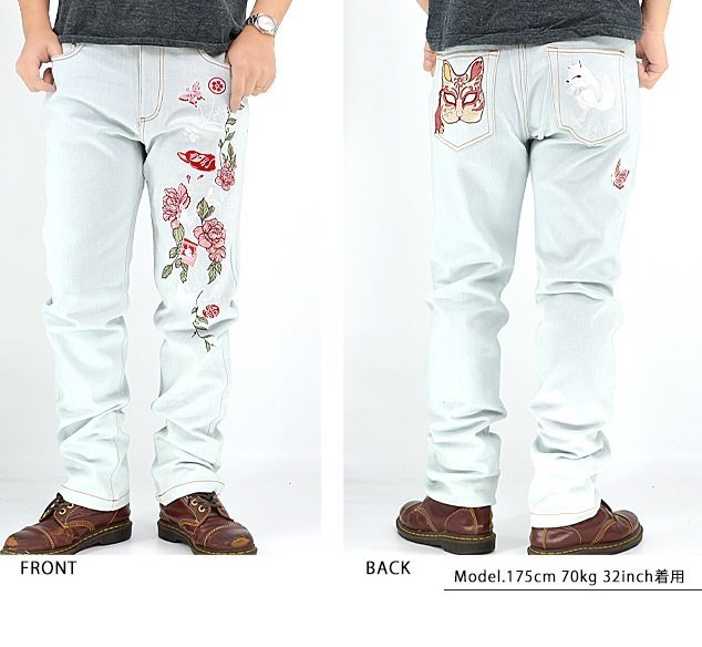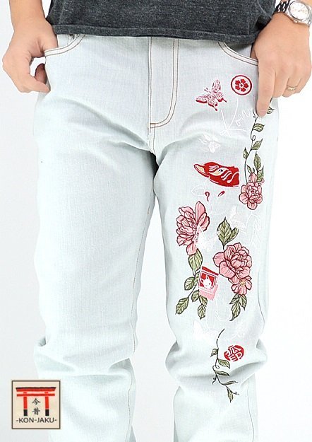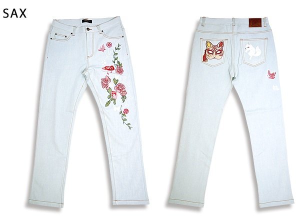 愛らしい狐のキャラクターが主役の【今昔】から「牡丹と狐のデニムジーンズ(KJ-29123)」のご紹介です。 今回は定番のインディゴデニムに加えて、新たに淡い色使いのデニムパンツをラインナップ。 フロントはジッパーフライ。 | |||||||||||||||||||||||||||||||||||
