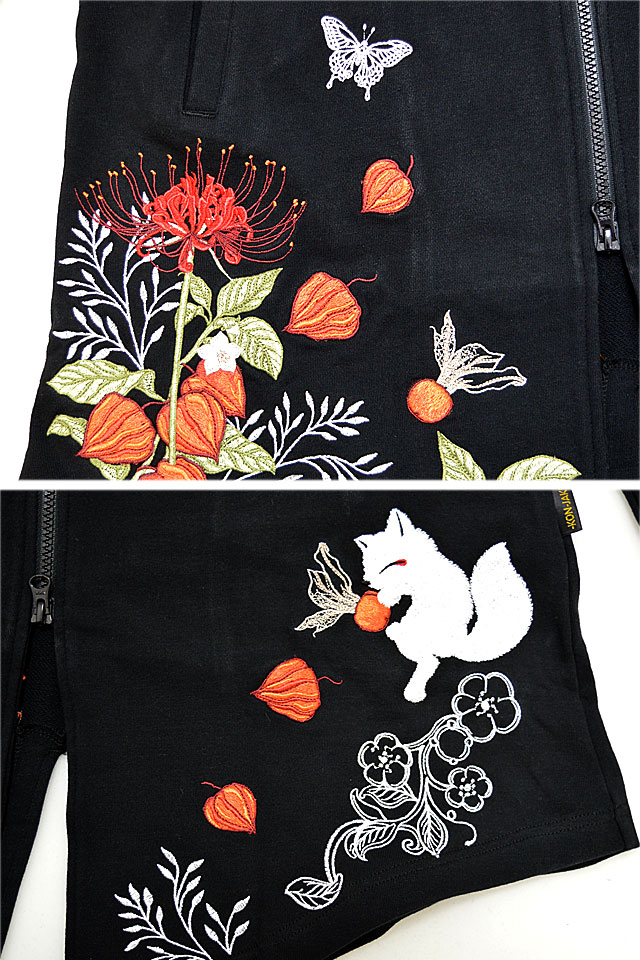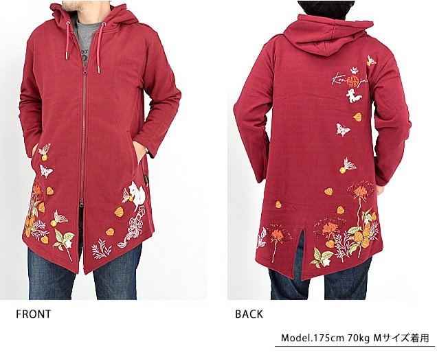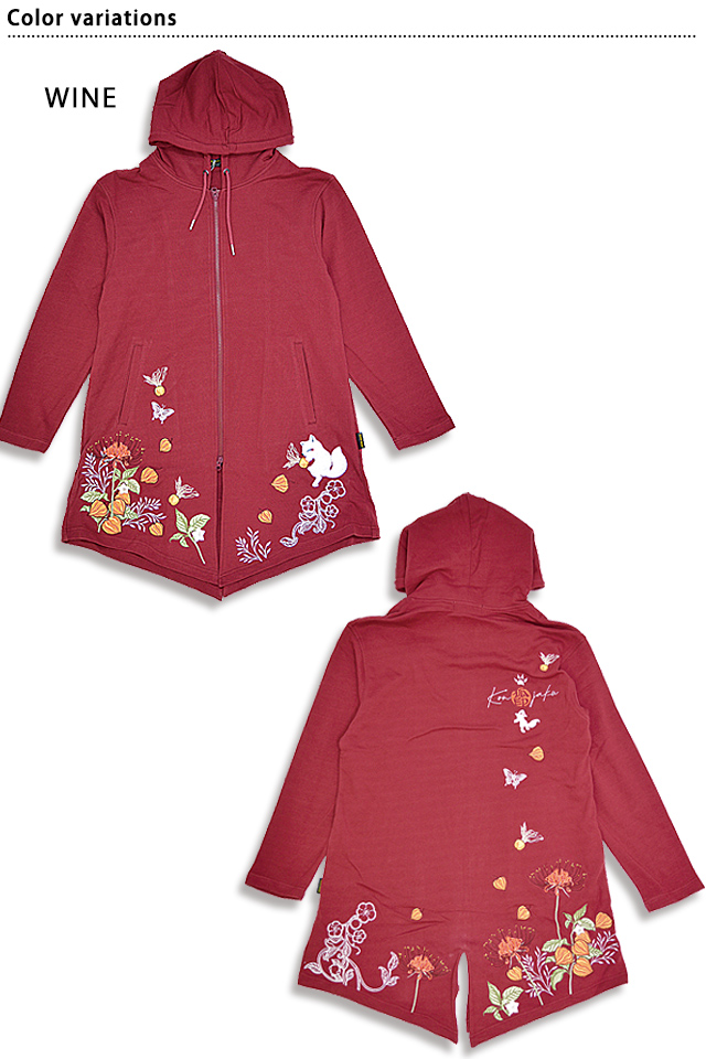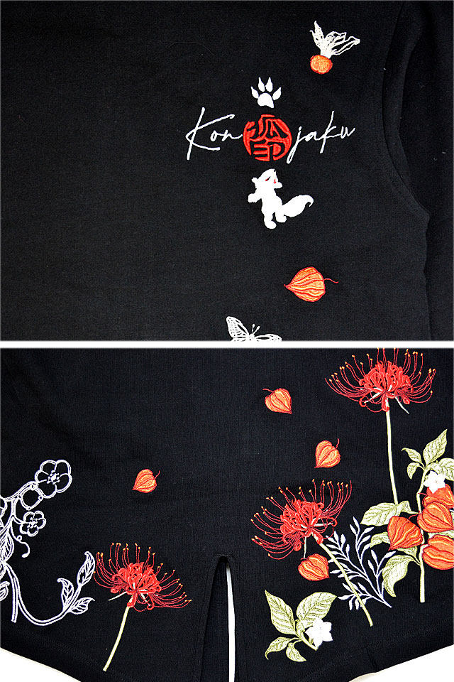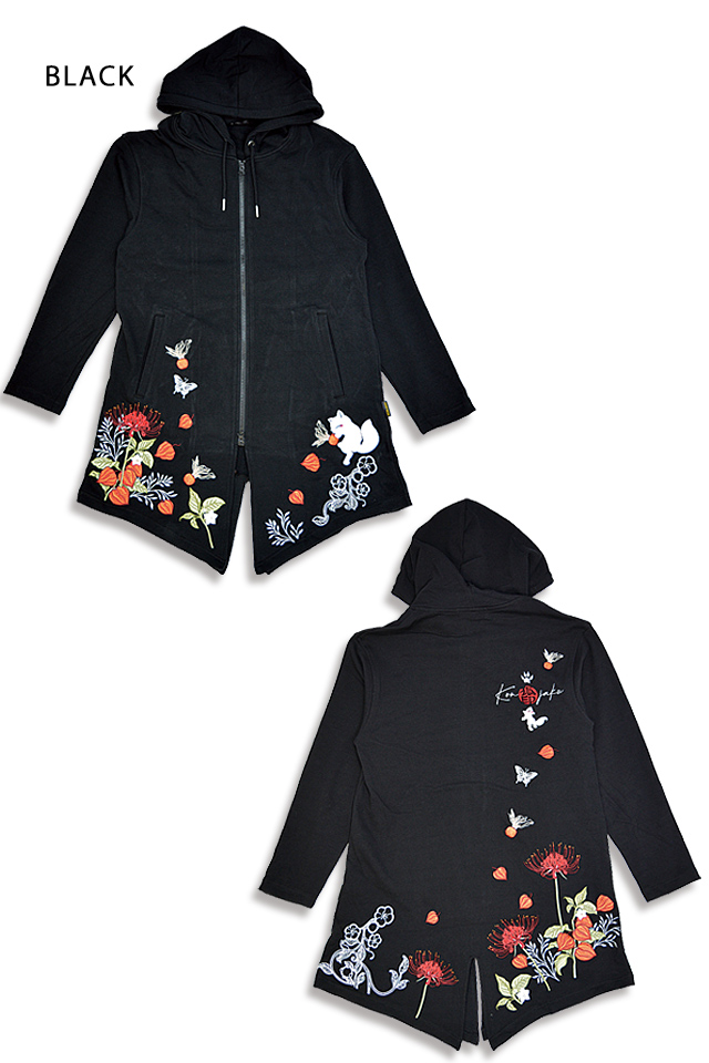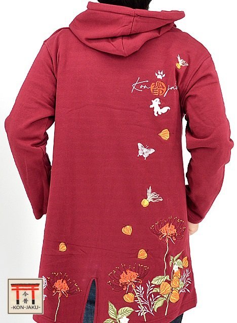 愛らしい狐のキャラクターが主役の【今昔】から「曼珠沙華 長丈ジャケット(KJ-29127)」のご紹介です。 丈の長いロングパーカーをボディーに採用し、着こなしに幅を持たせてくれるアイテムを製作しました。 今回は曼珠沙華をモチーフの主役に採用。 ボディーには裏毛タイプのスウェットを採用。 | ||||||||||||||||||||
