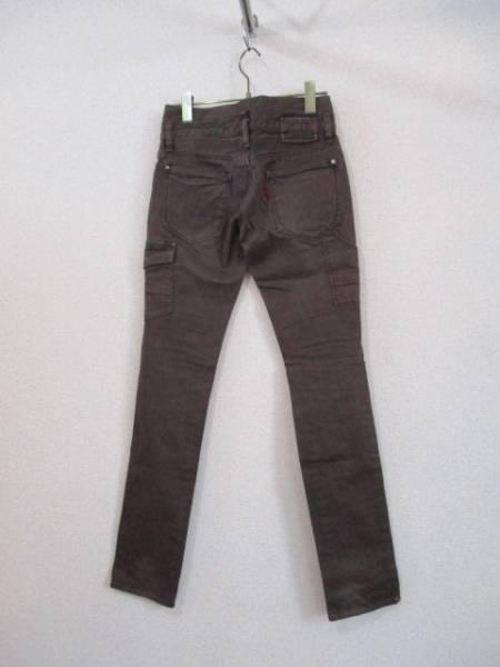 商品紹介 | 太ももの横に大きめポケットが付いた茶色のカラーデニムです。 形はスリムでスッキリとしたラインです。 ウエストはボタンが縦に2つ付いています。 後ろ右ポケットの左側に十字の赤い刺繍が入っています。 《素材》 綿95% ポリウレタン5% |