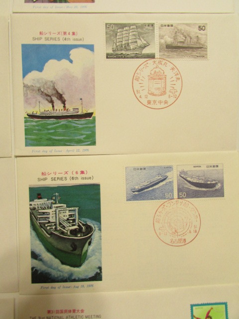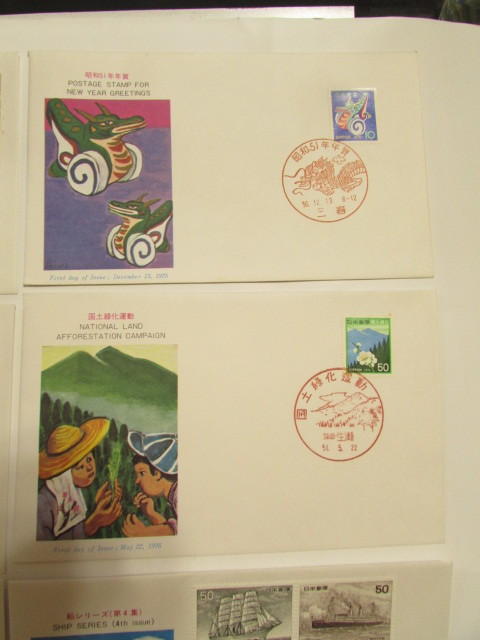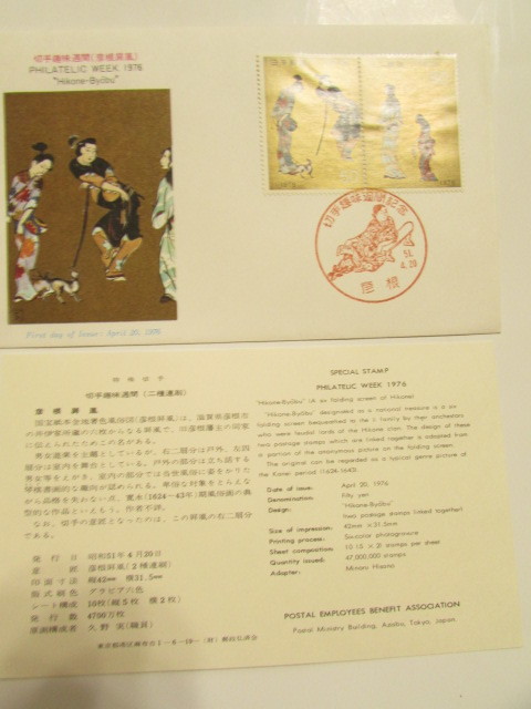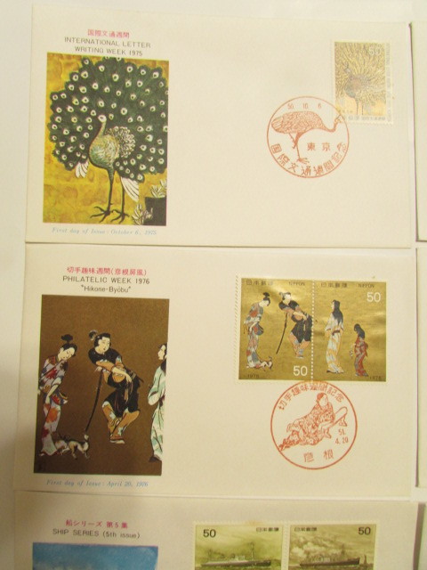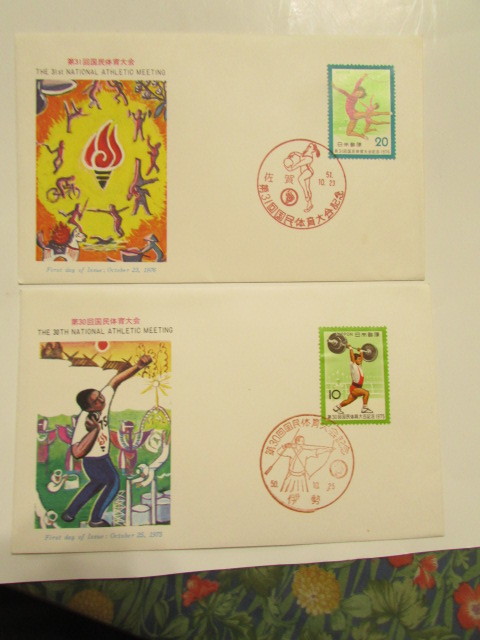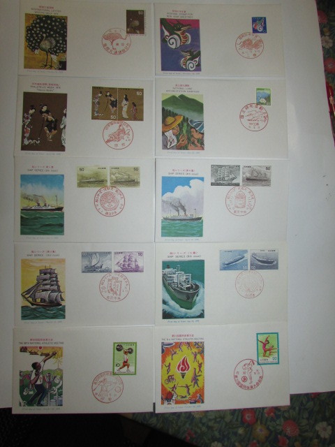 御覧の様な未使用の記念切手の付いた・・色々な記念の印と絵が描かれてい封筒です。