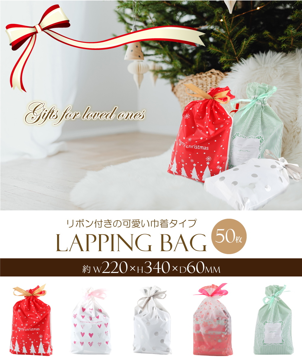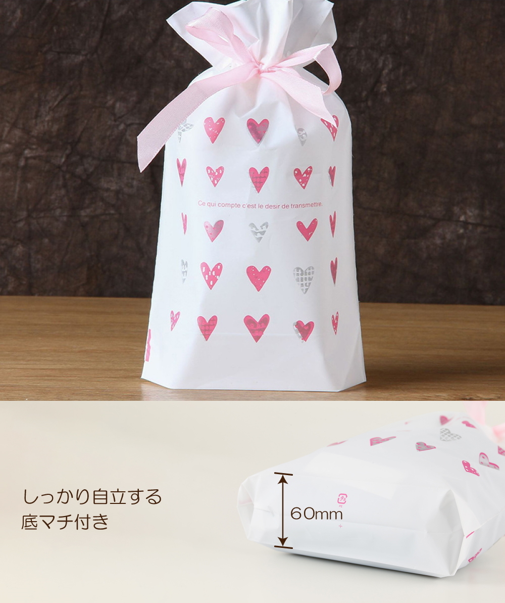 | ラッピング袋 リボン付きの可愛い巾着タイプ [イベントや記念日大切な方へのプレゼントに] 誕生日祝い クリスマスプレゼント 父の日・母の日 バレンタイン・ホワイトデー 記念日のプレゼント etc... [ラッピングしやすいリボン付き] プレゼントを袋の中に入れてリボンを引っ張って結ぶだけ。 可愛い巾着のラッピングができます。 [しっかり自立する60mmの底マチ付き] | |