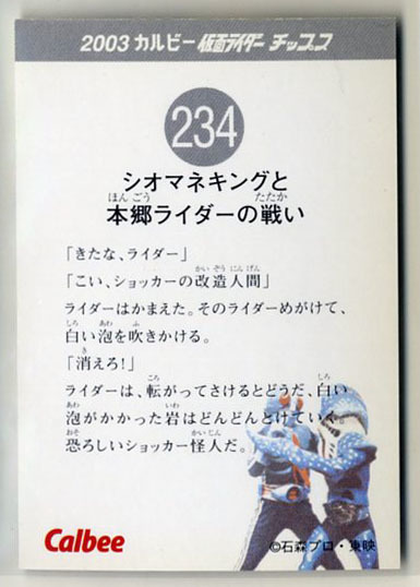 | ◆防水対策 厚紙補強 カルビー 仮面ライダーチップスカード(2003 復刻版) 234番 シオマネキングと本郷ライダーの戦い トレカ 即決 | |