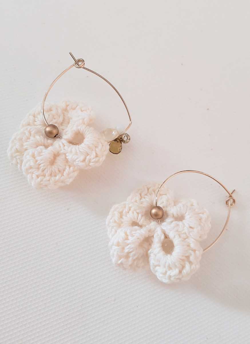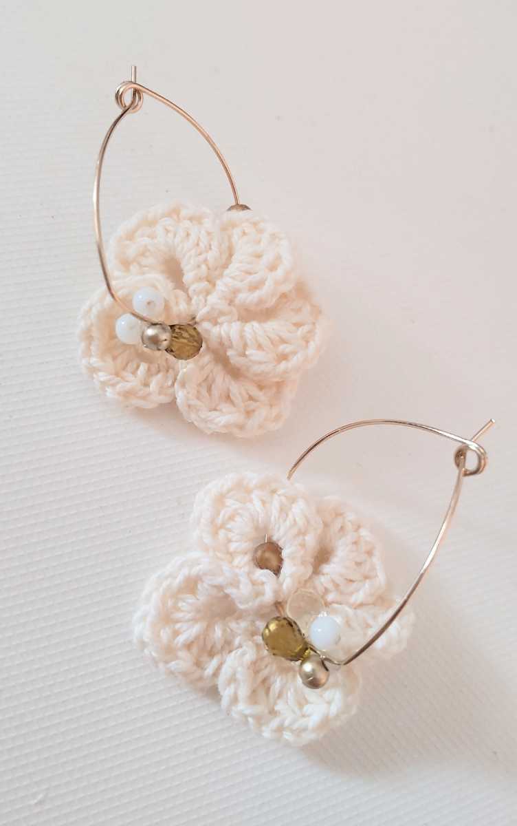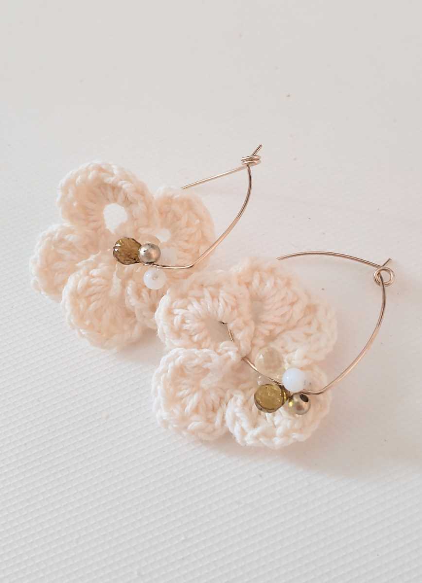 こちらは、ホワイトフラワー かぎ針編み アクリルビーズ フープピアス になります♪
