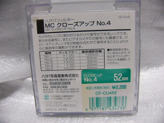 ■HAKUBA MC クローズアップレンズ CLOSE-UP No.4 52mm の美品です。