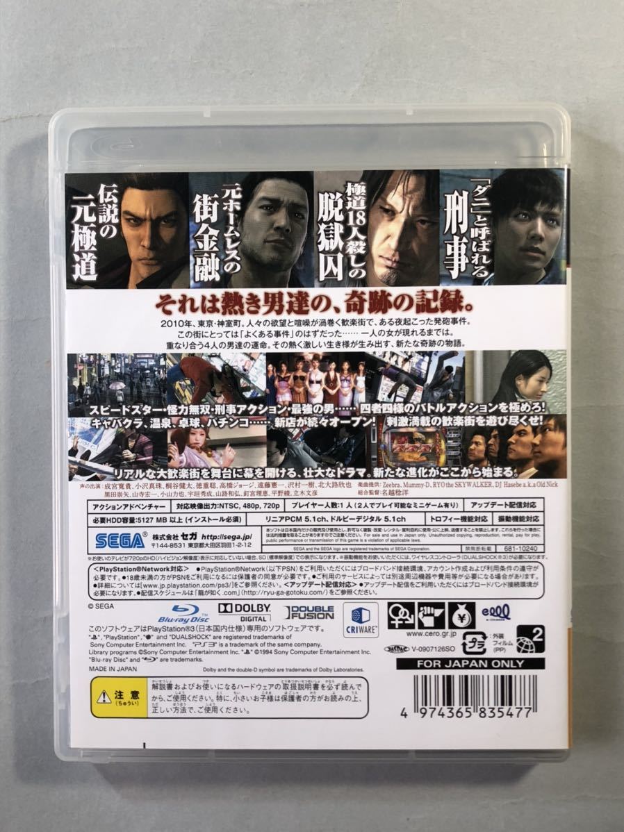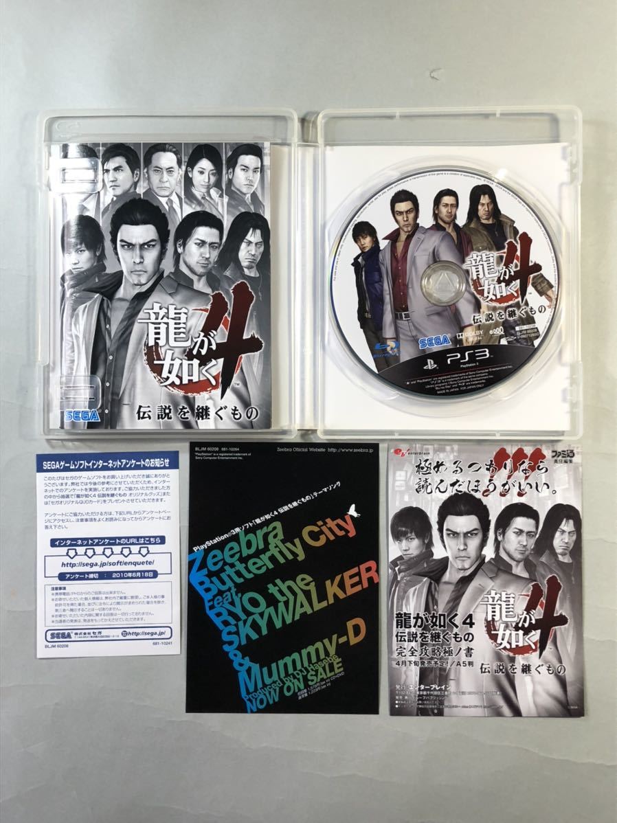 PS3フト 龍が如く4 伝説を継ぐもの「それは熱き男達の、奇跡の記録。」SEGAです。ケースに擦れ、細かな傷、線傷があります。ディスクのデータ読み取り面に微細な傷、細かな傷が少しだけあります。起動、動作確認済みです。写真のモノが全てです。新品をお探しの方や神経質な方の入札はご遠慮下さい。ノークレーム・ノーリターンで、お願いします。入札よろしくお願いいたします。 C04-241-042904