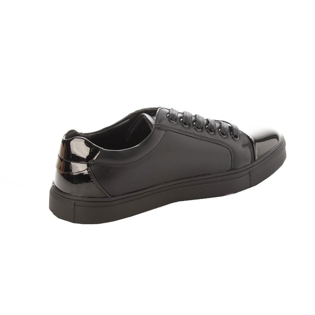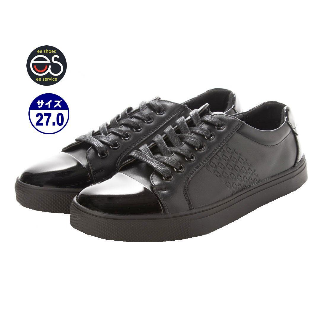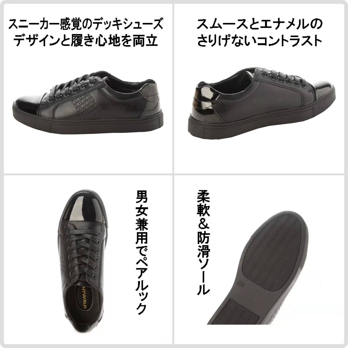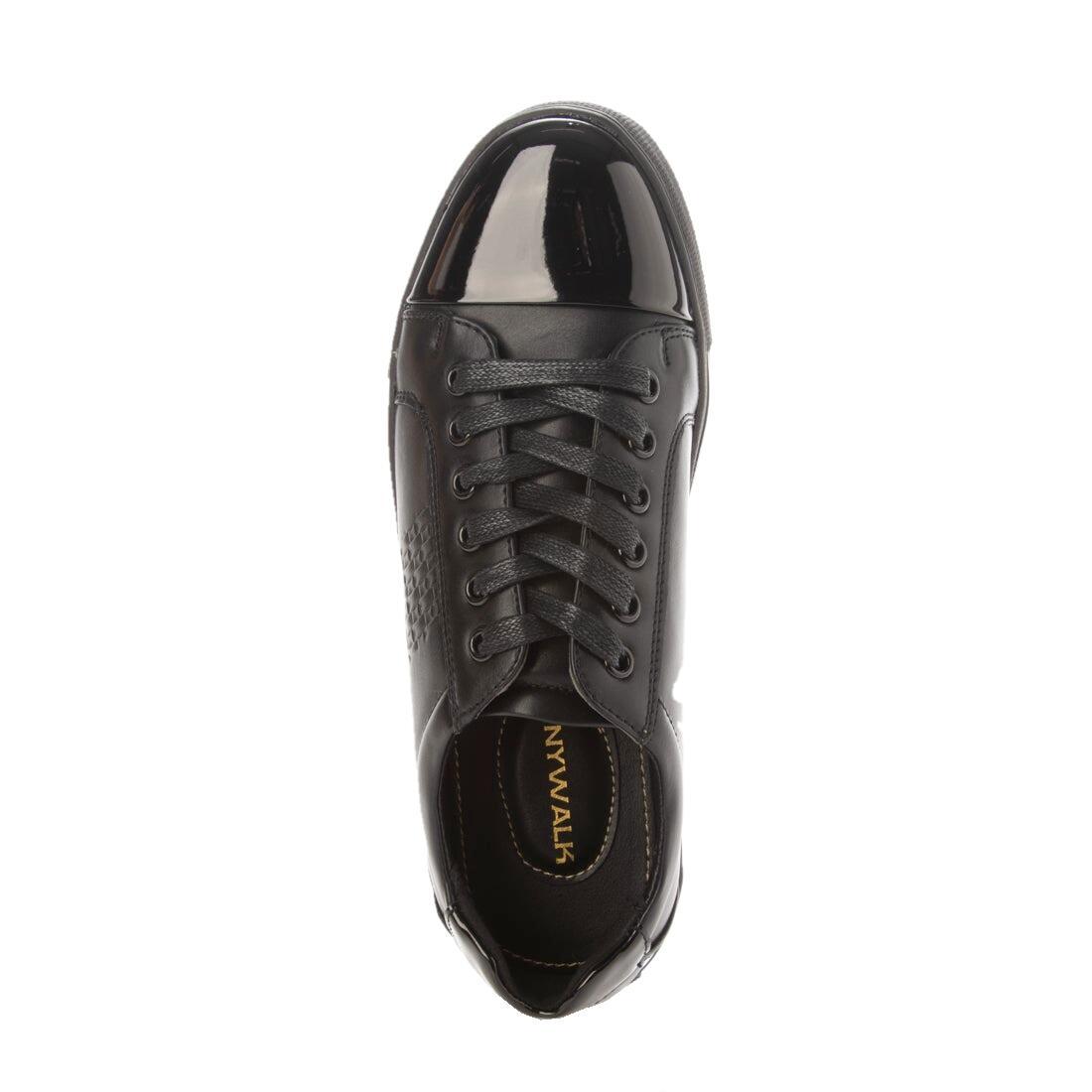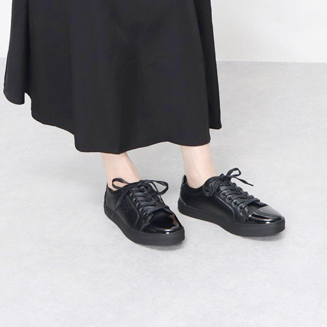 つま先とかかとに存在感あるエナメル材を使用、サイドにエンボス加工を施すことでトレンド感がアップ。