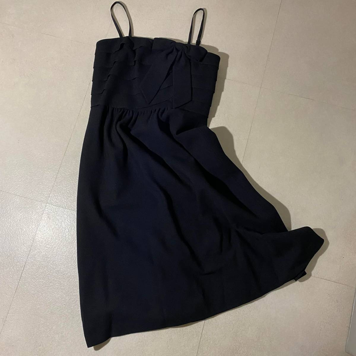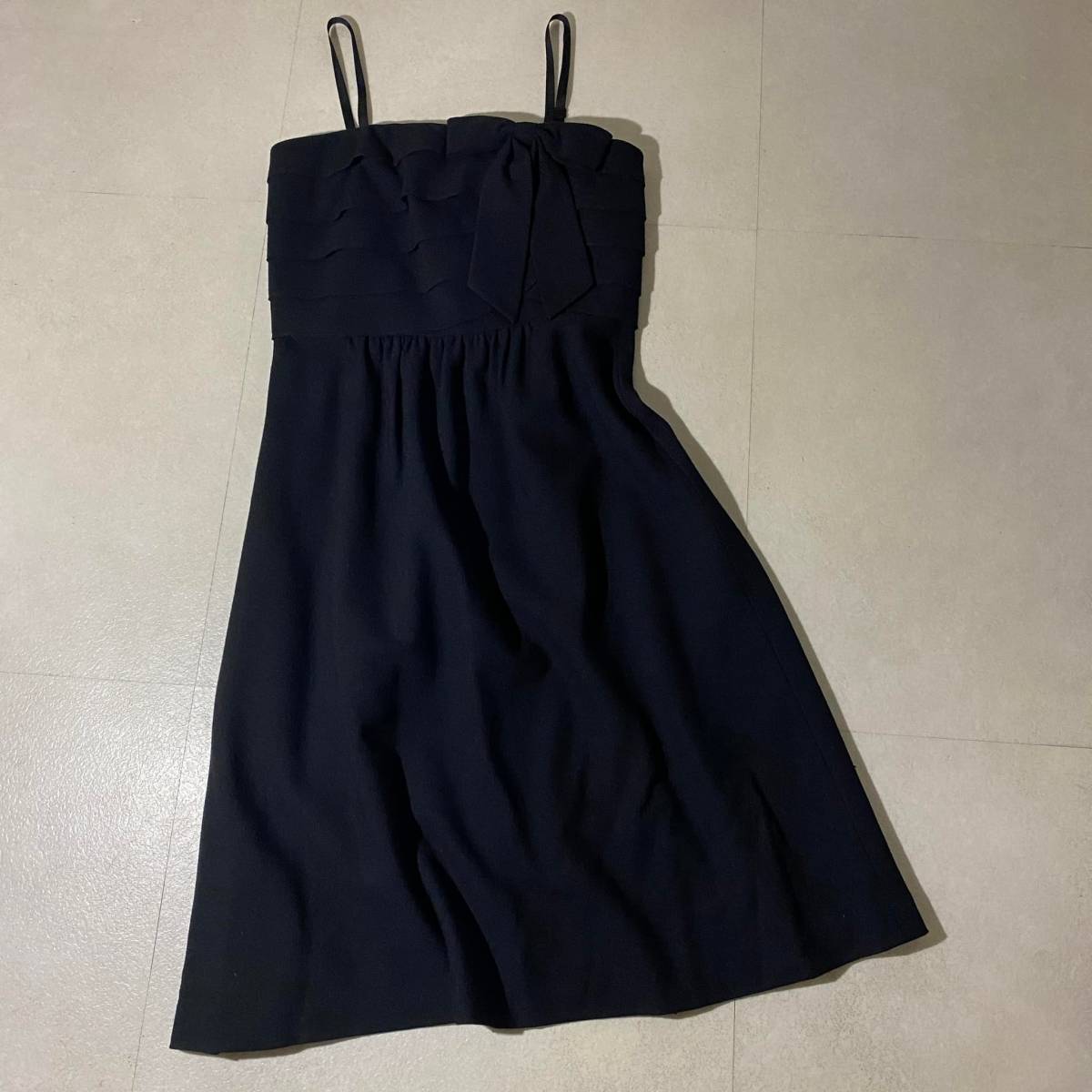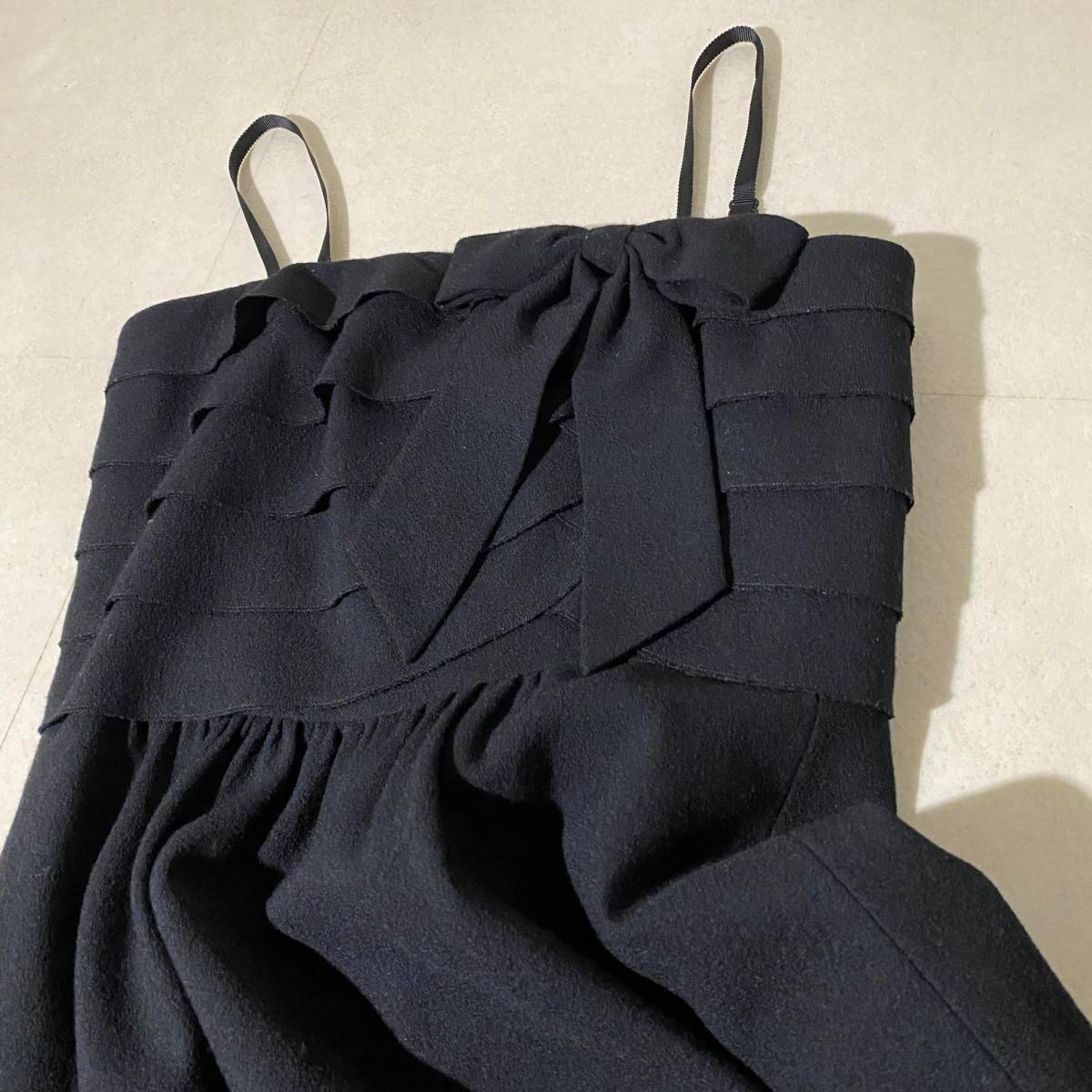 エレガントな黒のノースリーブ、胸元のリボンとフリルがゴージャスな一着です。ウール35%の化繊混紡。