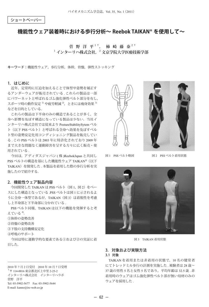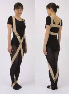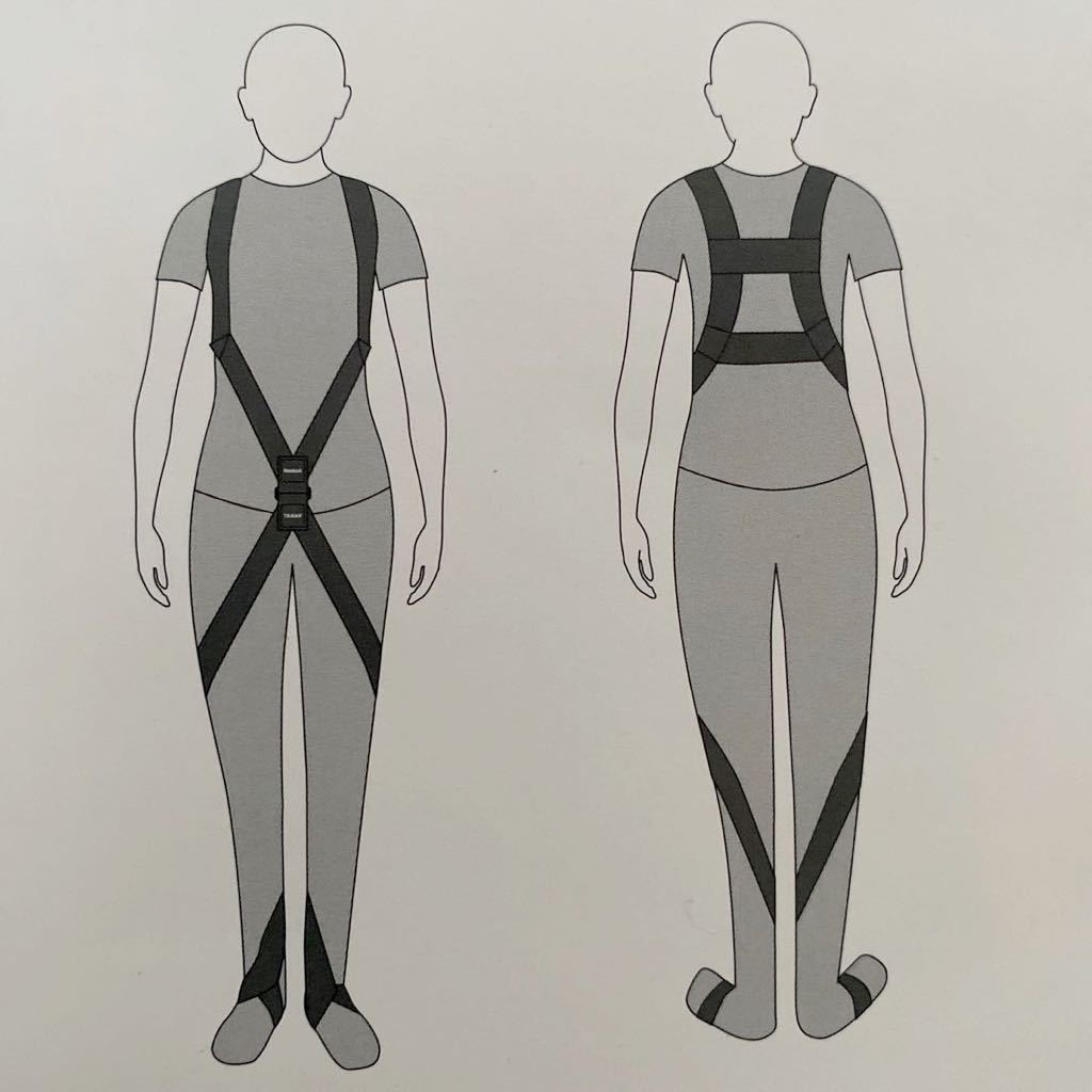ベルトは両肩から体幹前面を通る上半身部分と両足部かららせん状に両膝関節外側・大腿前面を通る下半身部分からなり、上半身部分と下半身部分は身体重心位置付近で連結するようにデザインされています。