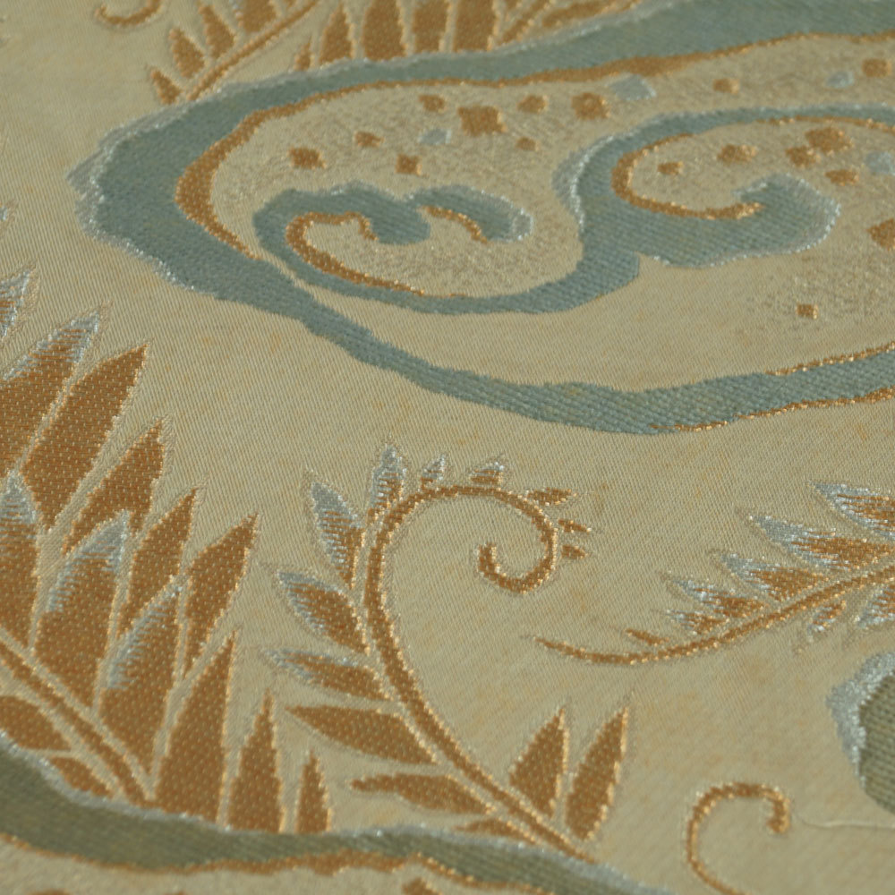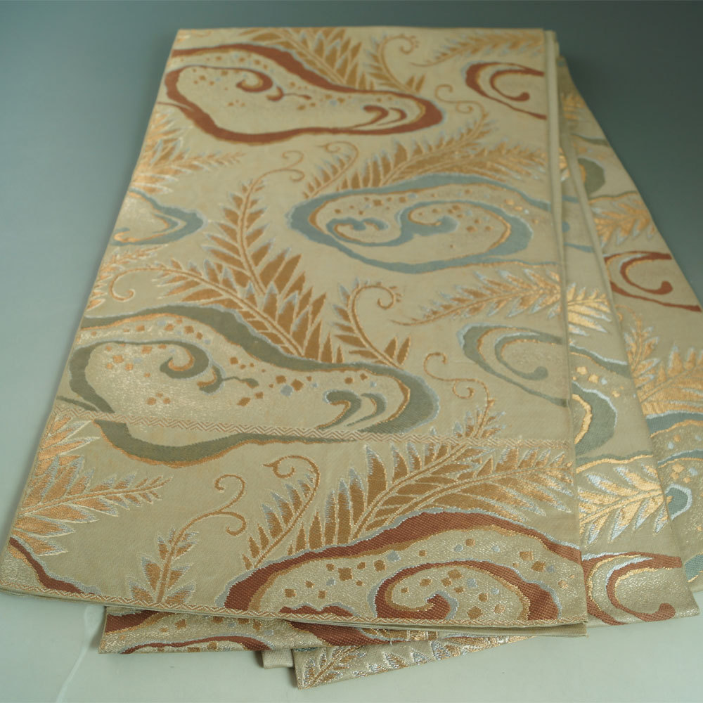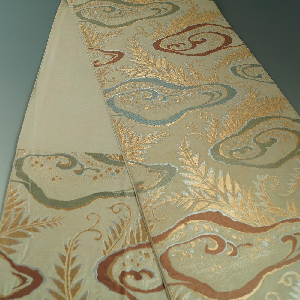 | 商品説明 | 絹鼠色系の地に金銀糸・色糸の流水に植物模様が織られた京袋帯です。 ※未仕立品ですが使用感・経年感・保存臭があり、全体にシミや汚れ、スレ、黄変シミが点在し、かなり汚れています。 柄付け:六通柄 垂先・手先を中に折りたたんで軽く縫ってとめてあります。帯芯は入っておりません。 |