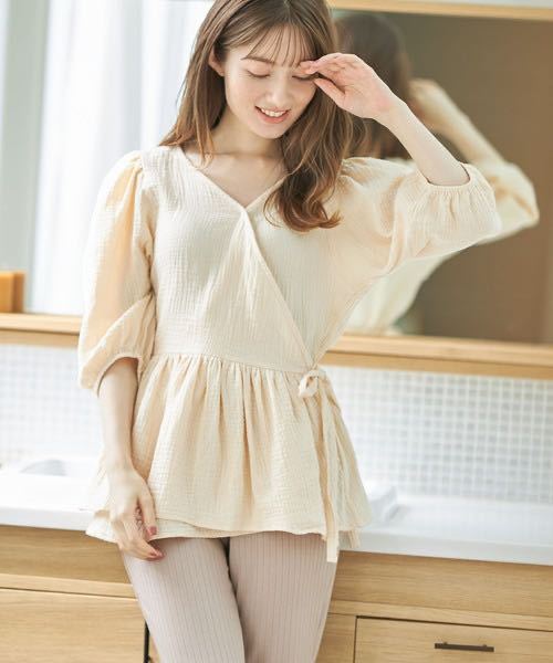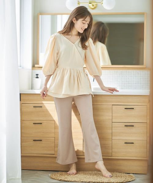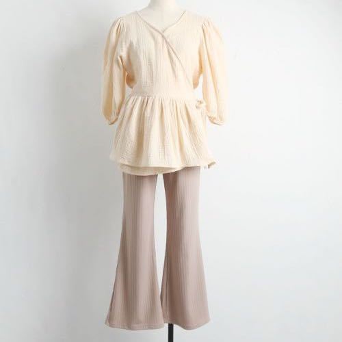 やさしい薄ベージュ色のカシュクールトップスとグレージュ系カラーのリブパンツのセットアップになります。