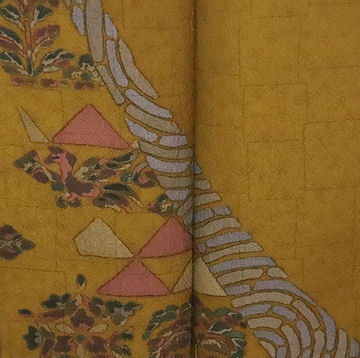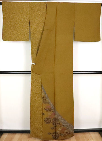 | 訪問着 袷 丹後縮緬地 ふくれ織地 金茶ぼかしふくれ織格子縞地模様地 地割れ模様・渦・鱗文・草花・鳳凰・馬・熨斗文 167 広襟 | |
