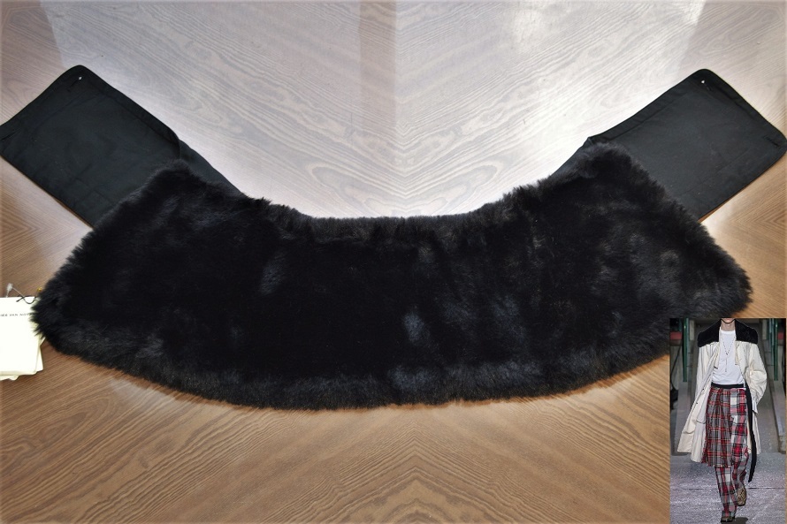 メンズウェアの長い歴史を紐解き、様々な要素が混ざり合うドリスヴァンノッテンらしいミックススタイルのアイテムを提案していたシーズンコレクションのひとつで、肩回りにアクセント感と温かさを与えてくれる【GARNETT VEST】というモデル名の肩当てマフラーです。