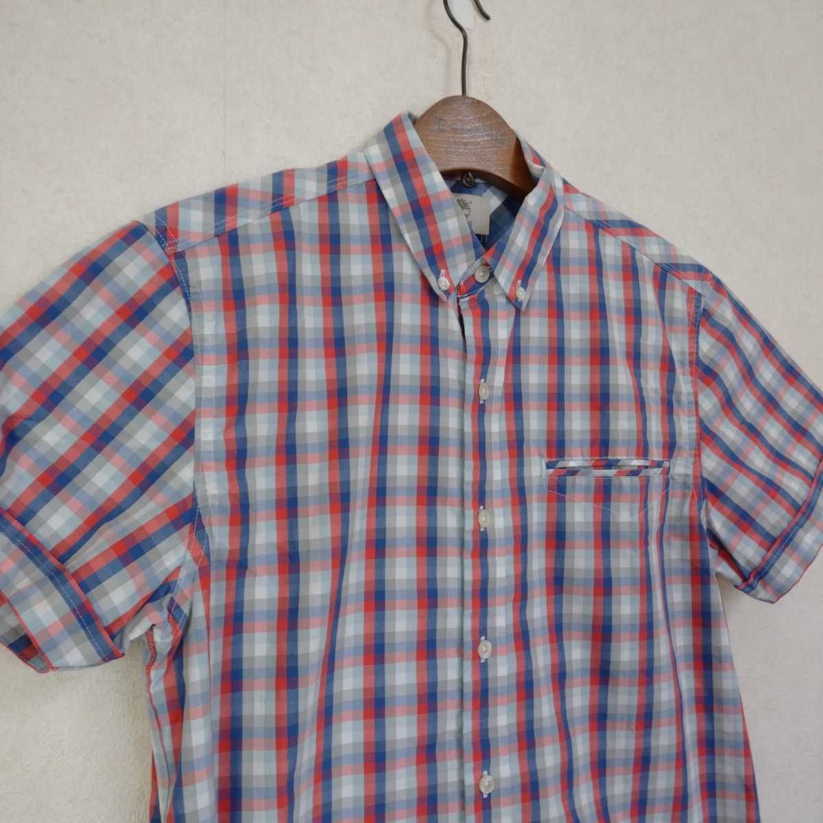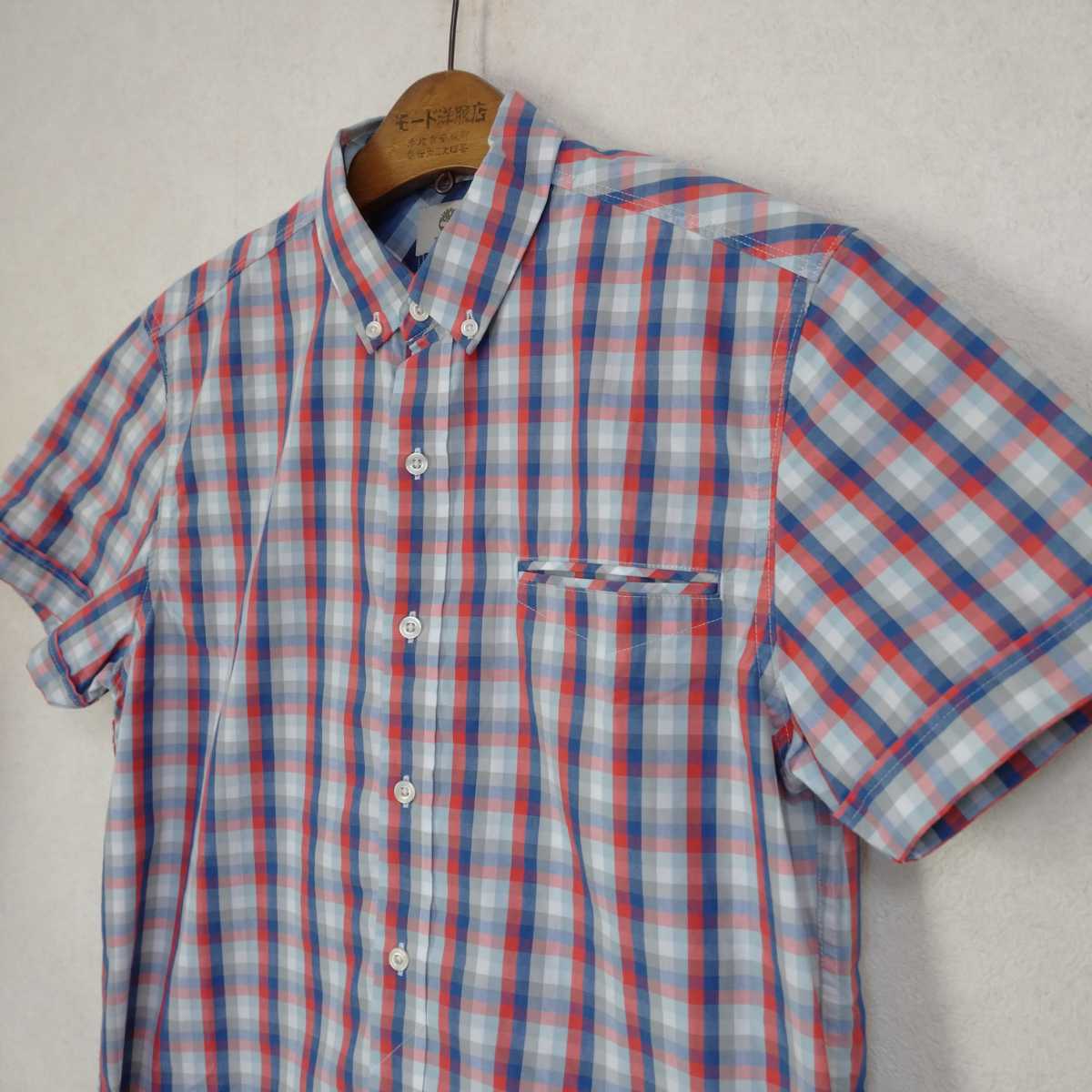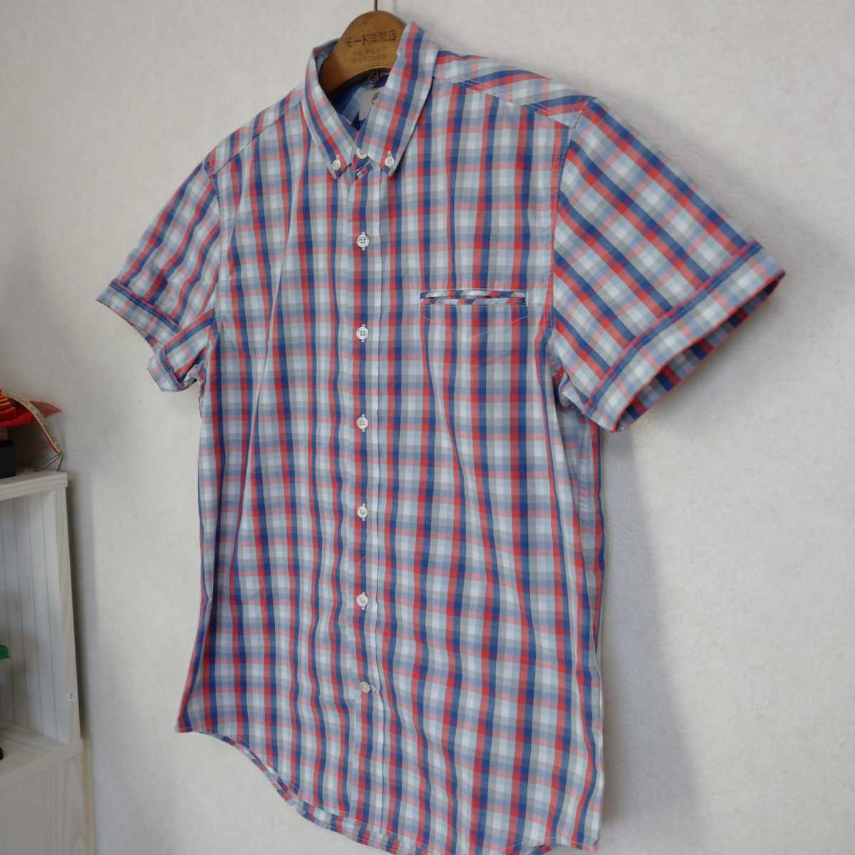 多少の誤差はお許しください。きれいで良い雰囲気です。パリッとした綿ポリエステル混紡、グレー赤紺チェック、ボタンダウン。できる限りダメージは説明させていただきますが、こちらが気づかない程度のわずかなしみ、よごれ、