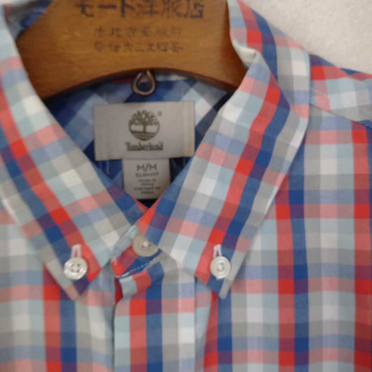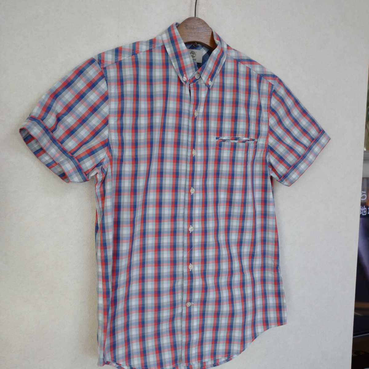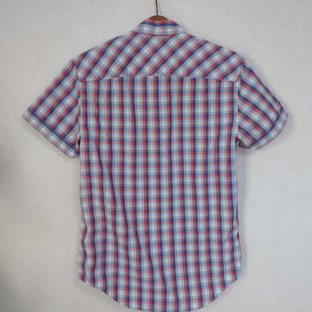 多少の誤差はお許しください。きれいで良い雰囲気です。パリッとした綿ポリエステル混紡、グレー赤紺チェック、ボタンダウン。できる限りダメージは説明させていただきますが、こちらが気づかない程度のわずかなしみ、よごれ、