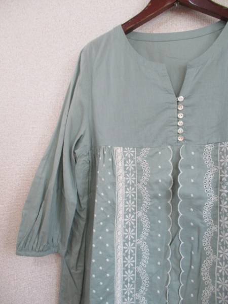 | 商品紹介 | ミントグリーンの地色に白い花とドットの刺繍が入ったワンピースです。 中央部分は波型にカットされ、その周りにドットや花モチーフの刺繍があり、 縦にレースが付いています。 胸元はスキッパーのような感じで少しV字に空きがあり、その下にボタンが付いています。 ハイウエスト位置に切替えがあって、ふんわりした形がカワイイです。 コットン素材の裏地付きで、透けるのを気にせずに来ていただけます。 《素材》 表地・刺繍部分・裏地:綿100% レース部分(チュール部分):ナイロン100% |