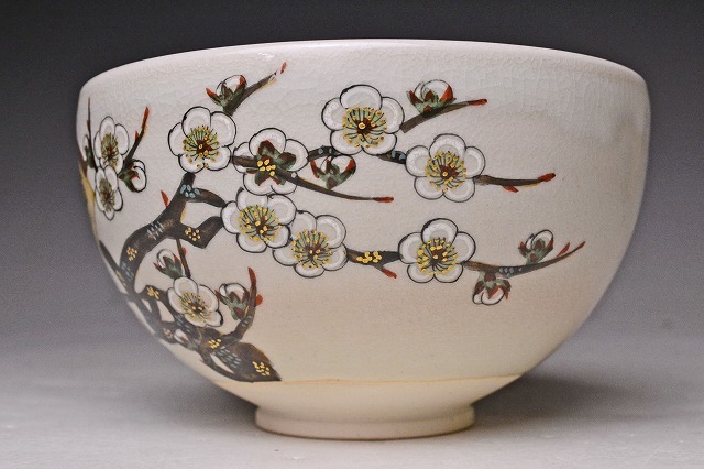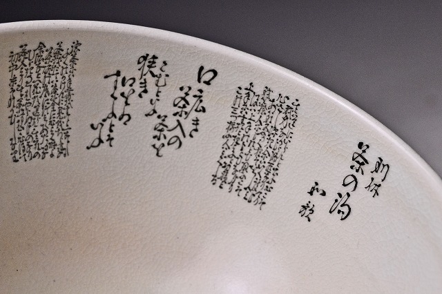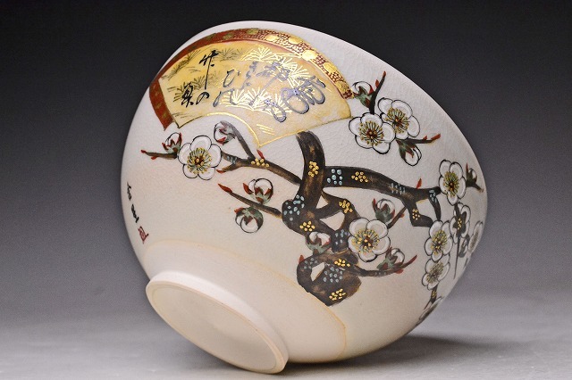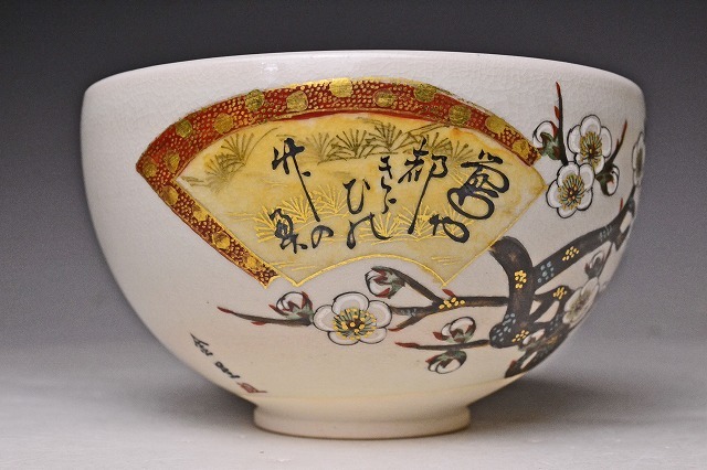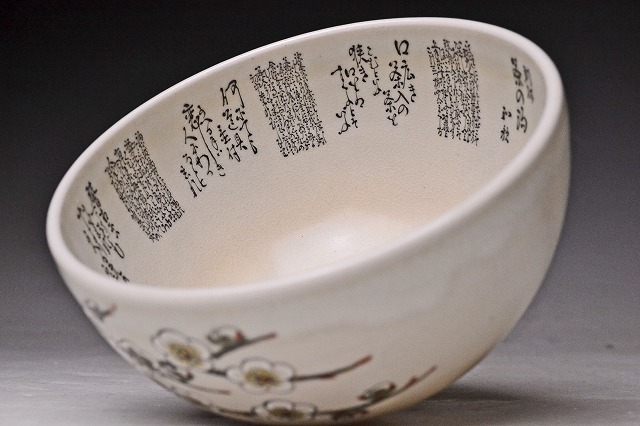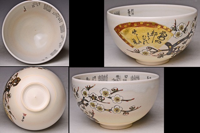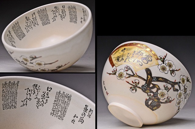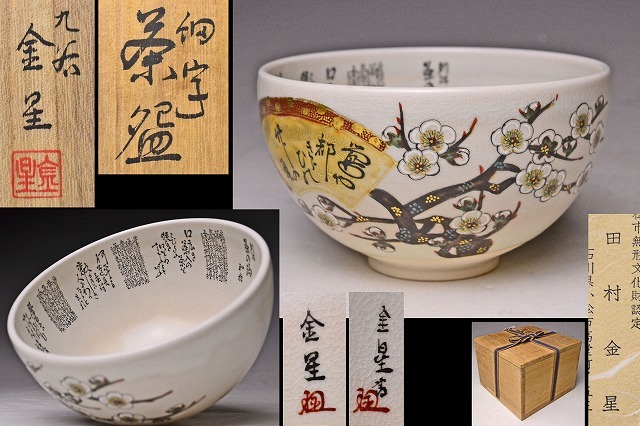 田村金星 ★ 九谷 毛筆細字 梅文 茶碗 ★ 共箱 栞 ★ 超絶技巧の細字が見事で雅な逸品 ★ 利休茶の湯の和歌写 ★ 茶道具 ★