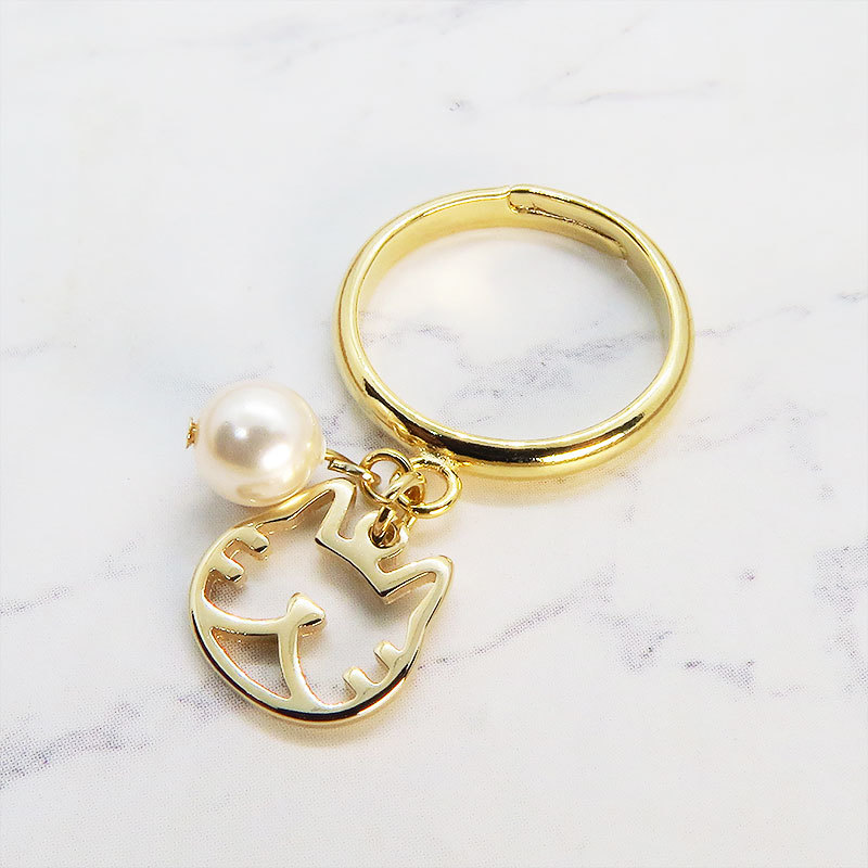 ゴールドカラー 猫フェイス(ハチワレ)フレームとスワロフスキー・パールの大人可愛いリング フリーサイズ