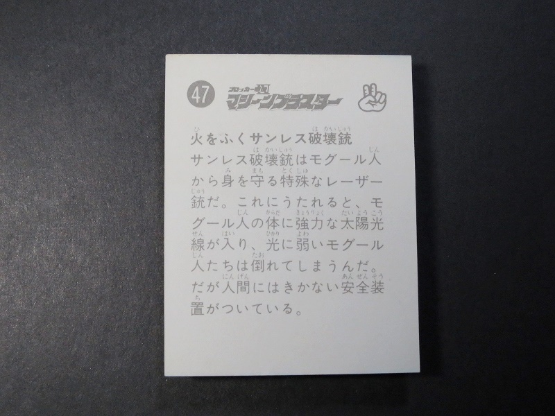 ブロッカー軍団IVマシーンブラスター ミニカード バラ売り ・メーカー:天田 ・6.5cm x 5.0cm ・1976年、当時の放送時に販売 ・1-60.全60種.AL2種 シリーズ ・開封後ファイル保存(製造工程による汚れや傷がある場合があります。) ・同梱発送可能(複数落札の場合:定形、定形外郵便は、送料が変わる場合があります。) 〓参考項目〓 ・原作葦プロダクション、八田朗(山本優) ・総監督案納正美 ・キャラクターデザイン高橋資祐、坂田ゆう ・メカニックデザイン七戸洋之助(大河原邦男)、松田豪、清水春雪 ・音楽筒井広志 ・アニメーション制作葦プロダクション ・製作日本アニメーション、葦プロダクション、フジテレビ ・放送局フジテレビ系列 ・放送期間1976年7月5日 - 1977年3月28日 ・話数全38話 〓声の出演〓 ・飛鳥天平/安原義人 ・石田巌介/玄田哲章 ・ビリー剣城/津嘉山正種 ・早見仁太/つかせのりこ ・ユカ/麻上洋子 ・ピコット/小宮和枝 ・由利博士/加藤精三 ・ヘルクイーン/弥永和子 ・ザンギャック/野本礼三
