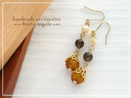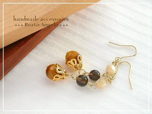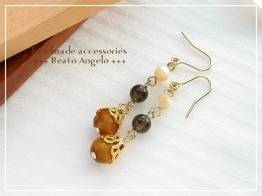 ♪+angelo+天然石タイガーアイとマザーオブパールのピアス(p-011)G 虎目石 スモーキークォーツ