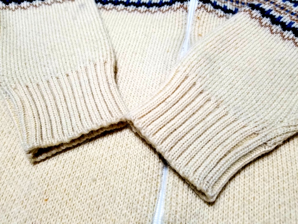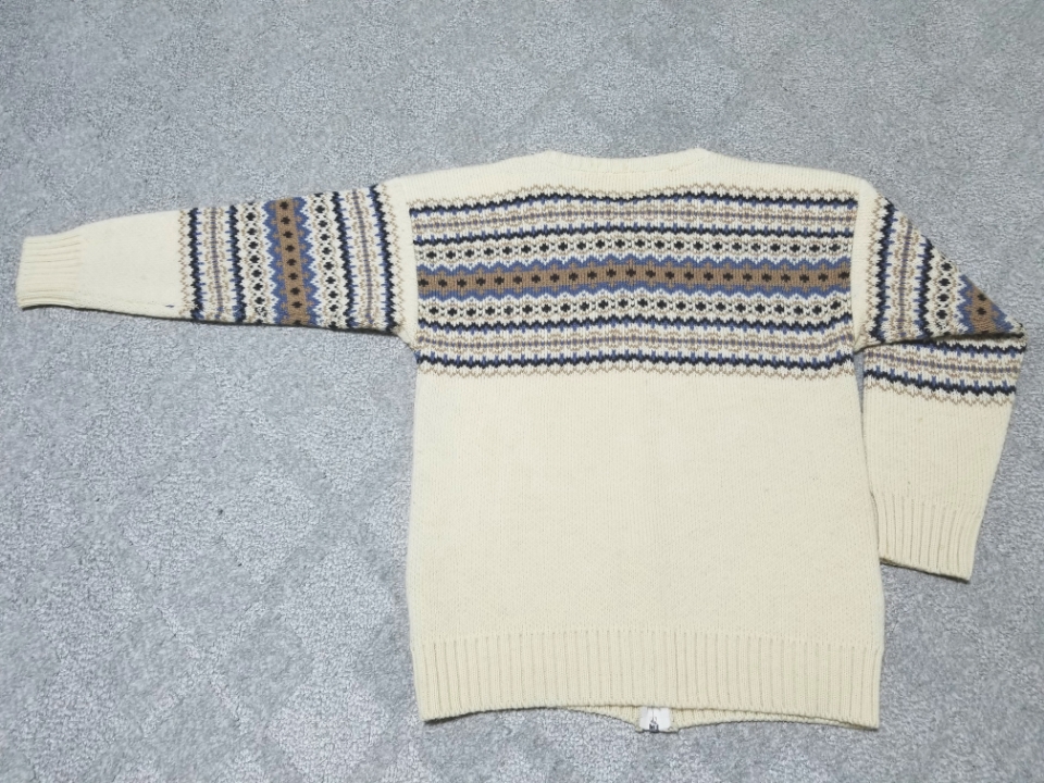 ウール100%の良い柄で程よく厚みのあるしっかりとした作りで、セーター的に着たりカーディガン的に着たり様々なコーディネートが出来る一着です、サイズ表記はSです。