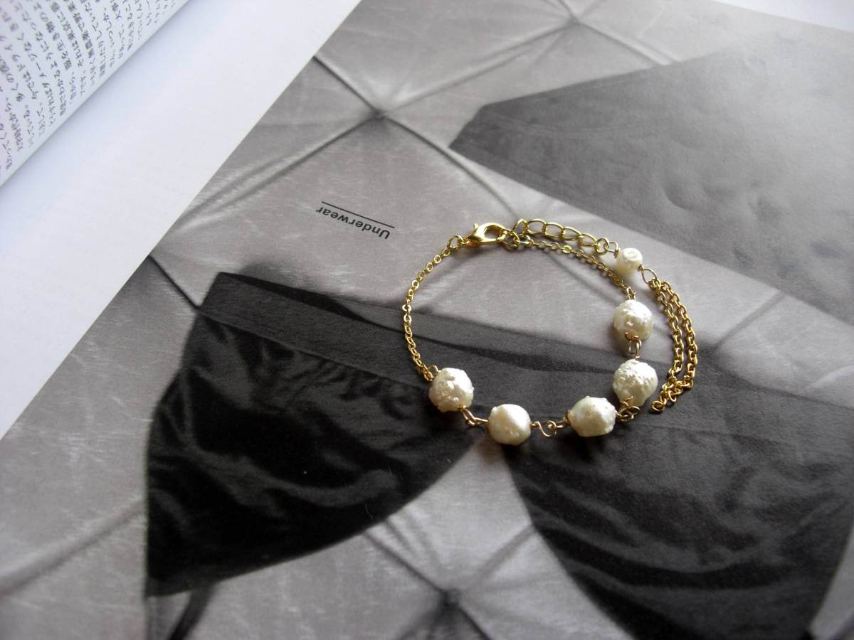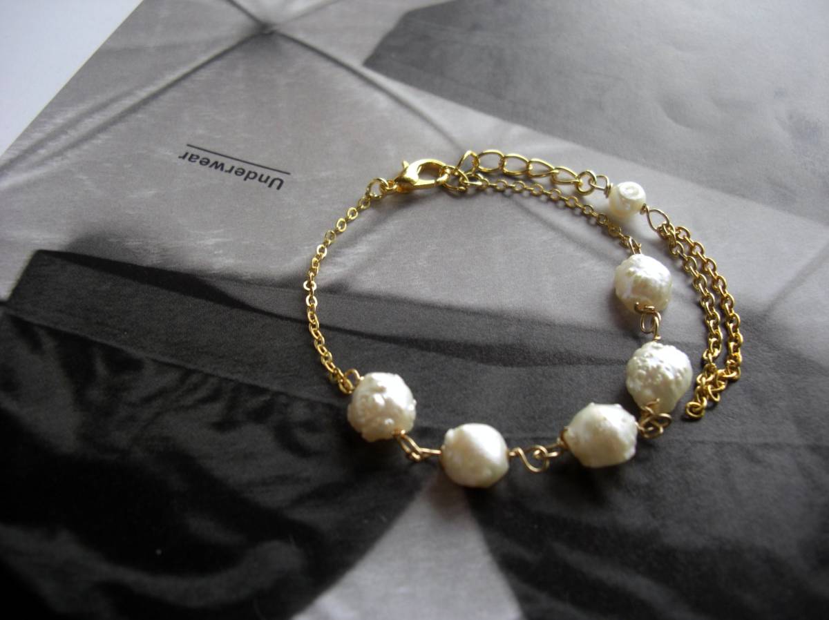 私的スタイル・・シリーズです♪パールをアートして・・個性的なバロックパールのブレスレットです♪ 8ミリ位のオフホワイトのバロックパールを繊細なチェーンで紡いでアンティークな表情です♪です♪長さは17センチ+アジャスター5センチで最長22センチ位です♪ お揃いのブレスレットやネックレスやピアスも出品しています♪ハンドメイドを ご理解頂いてノークレーム、ノーリターンでお願いします