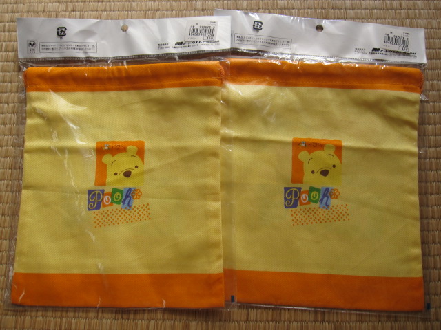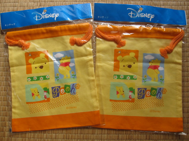 | Disnyディズニー、プーさんの巾着袋。同じ柄が2枚セットです。 お子さんのコップ入れや小物入れに。 未使用ですが、中古、保管品です。 サイズ:23×20cm 綿100%、日本製 |