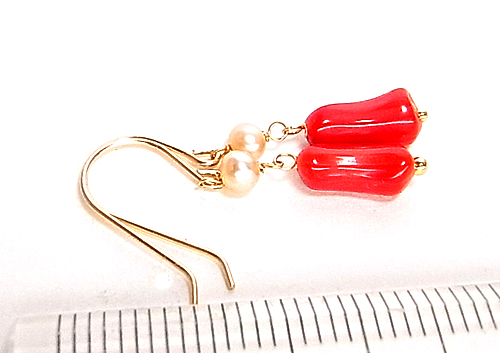 自然な形の赤サンゴとウォーターパールの組み合わせです。耳元へ可愛らしさをお届け♪