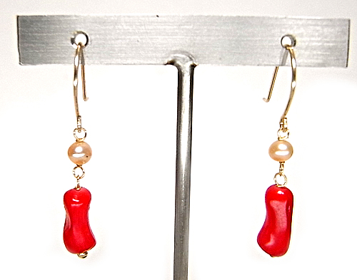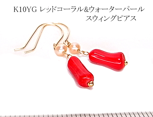 ナチュラルシェイプのレッドコーラルとウォーターパールのデザインスウィングピアスです。新品在庫です。