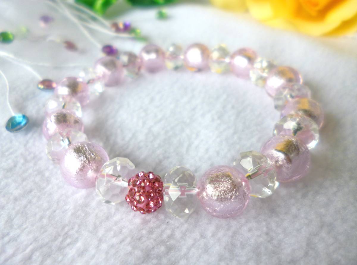 銀箔の上に、可愛らしいピンクガラスヴェネチアンビーズ