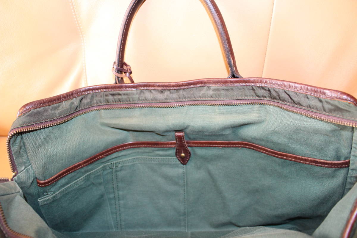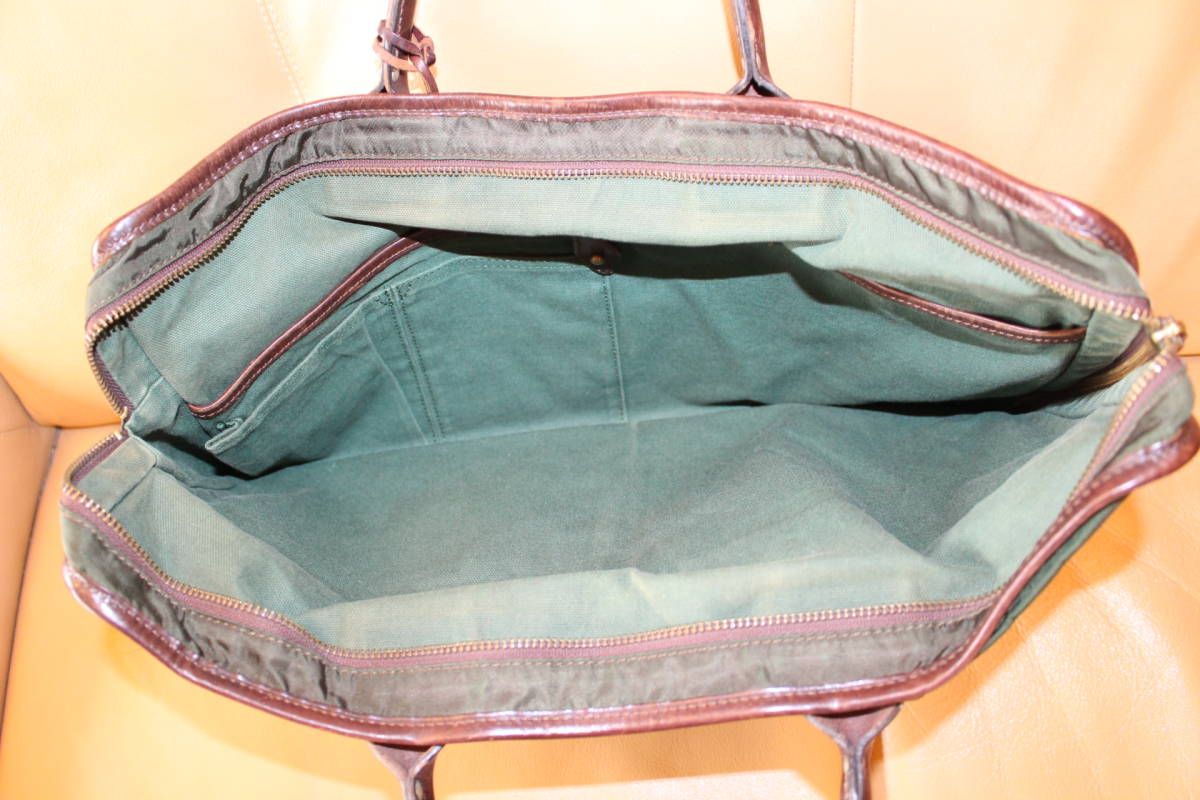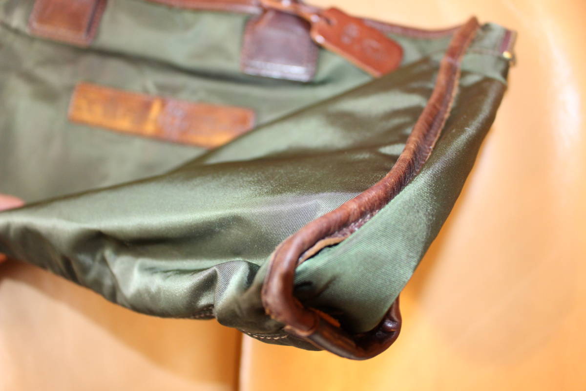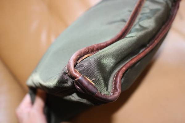 内部にスナップボタンどめ大ポケット1、内張りは緑のコットン