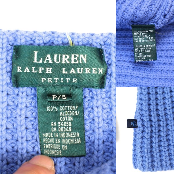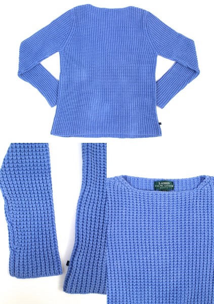 LAUREN Ralph Lauren コットンボートネックニット サックスブルー/Sワッフル編み ローレンラルフローレン