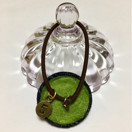 デニム生地にスタッズと刺繍糸でニコちゃんの顔を作りました。裏はフェルトを貼り付けています。