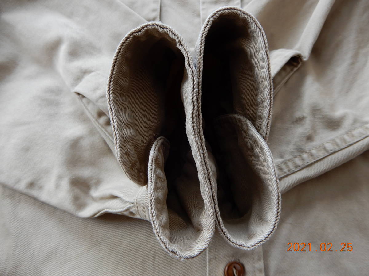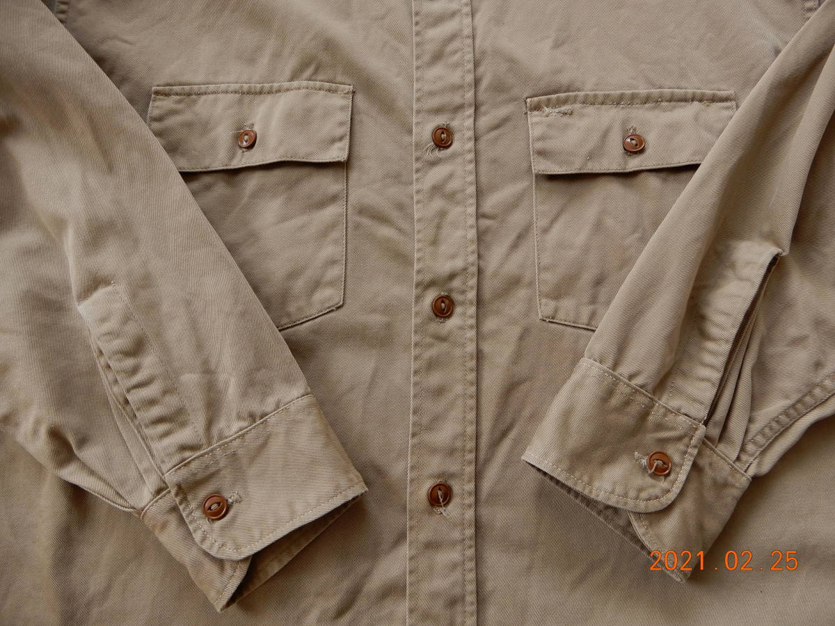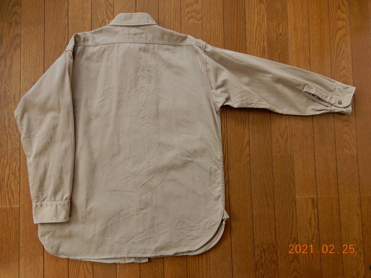 穴、ダメージ、汚れ無く、生地肉厚で素晴らしい状態です。襟ダブルステッチ、襟芯無し、サイド巻き縫い、アーミークロス、マチ付き、猫目ボタン。マチ付きですがあまり着丈も長くなく、合わせやすいです。サイズ感も良く、条件の揃った40sのシャツも珍しいです。