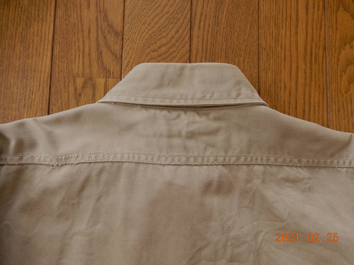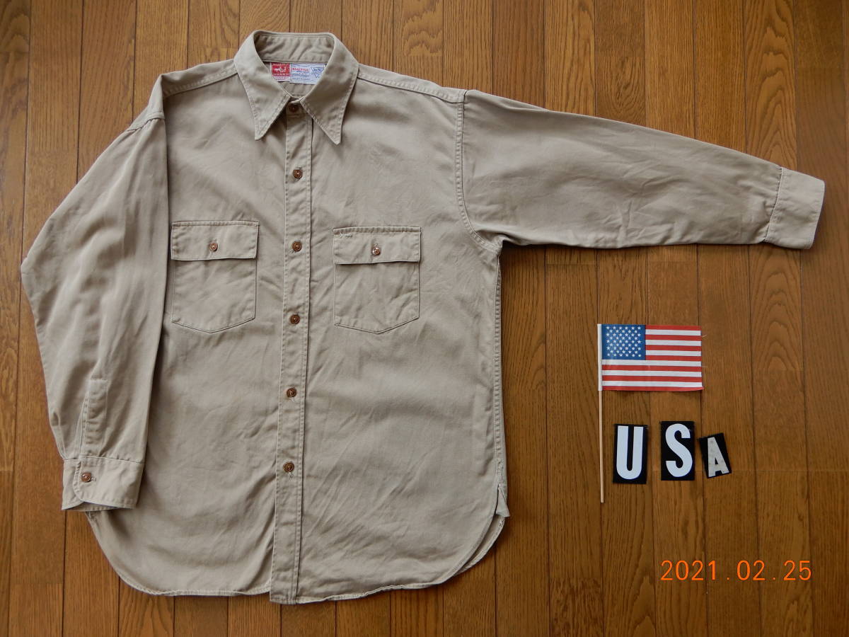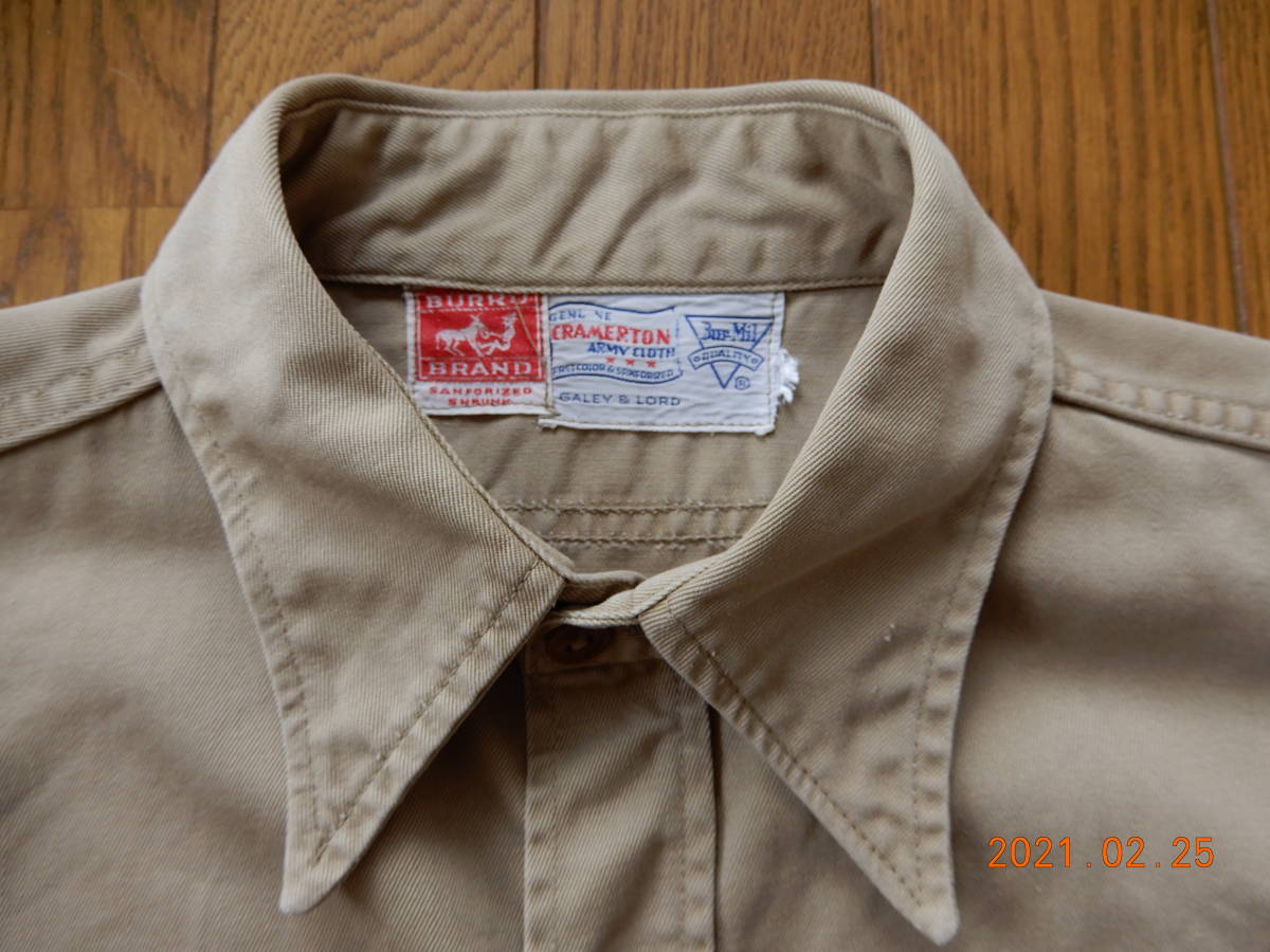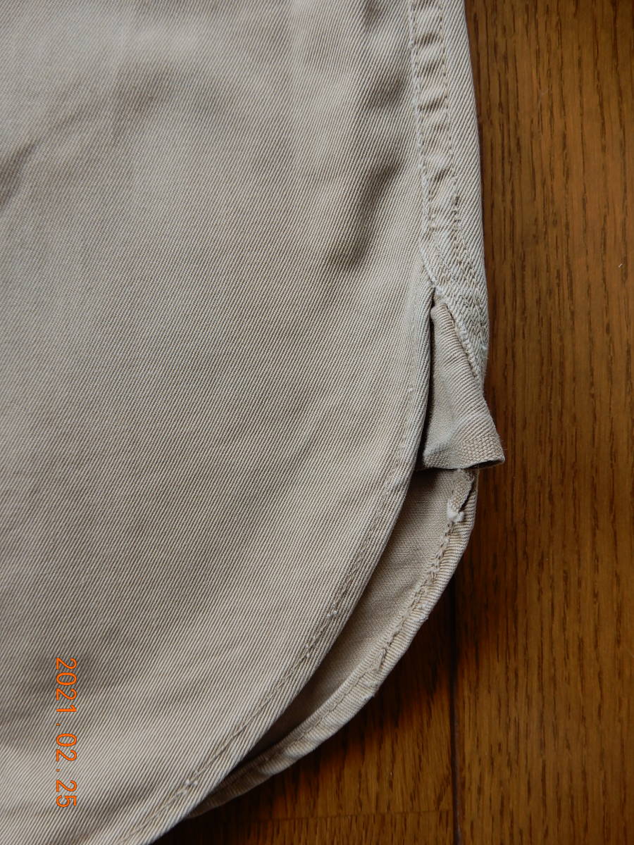 穴、ダメージ、汚れ無く、生地肉厚で素晴らしい状態です。襟ダブルステッチ、襟芯無し、サイド巻き縫い、アーミークロス、マチ付き、猫目ボタン。マチ付きですがあまり着丈も長くなく、合わせやすいです。サイズ感も良く、条件の揃った40sのシャツも珍しいです。