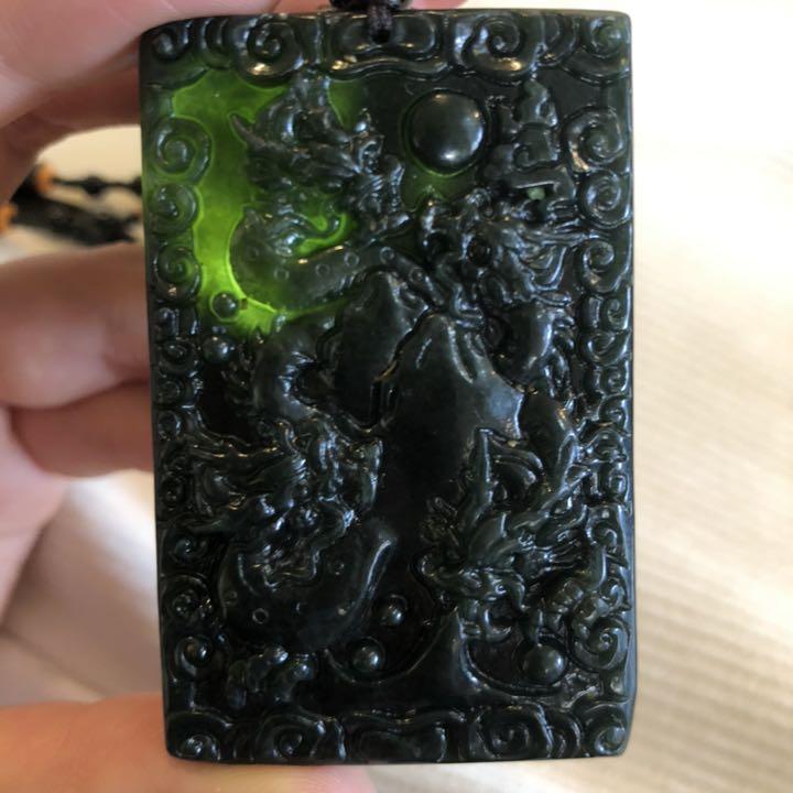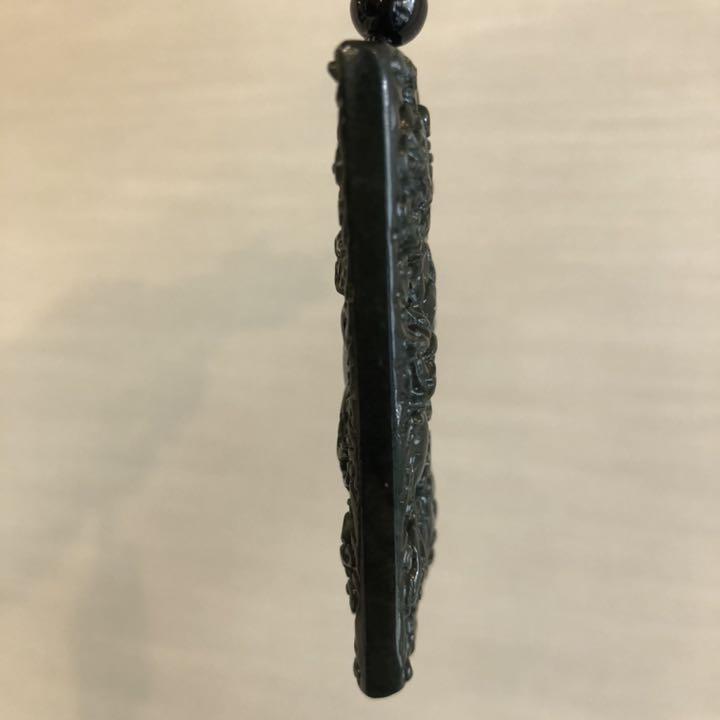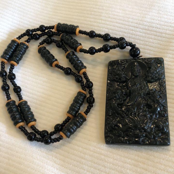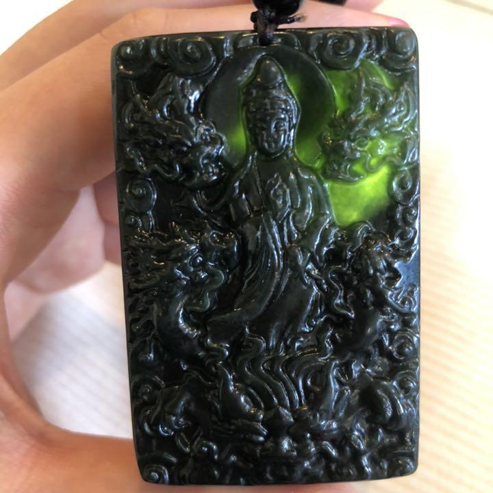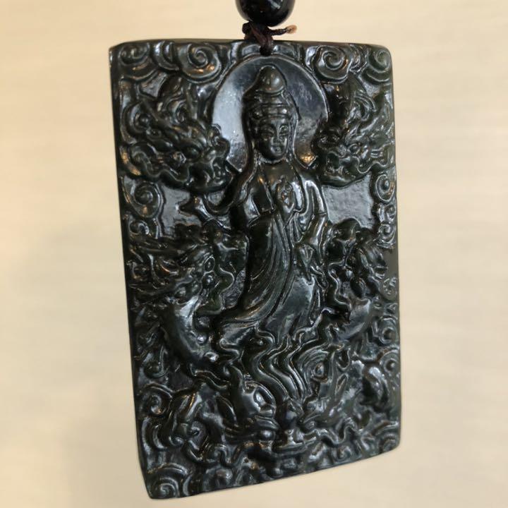 0005 パワーストーン 天然石 御守り 翡翠 和田玉 ネフライト 軟玉 彫刻 仏像 ネックレス ペンダント アクセサリー 仏像 観音様 龍 新品(一つひとつ手作りのため、キズ・汚れなどございます) 一つひとつ職人さんの手作りです。 天然石なので、全て1点もの。 同じものは一つもありません。 この高い工芸技術に魅了されてしまいますよね。 和田玉(ほーたんぎょく)は、中国で採取される翡翠(ヒスイ)です。 中国の「国石」である軟玉(ネフライト)に分類され、軟玉の中では比較的硬いため、繊細な彫刻が可能で、保存もしやすいです。 知恵と安らぎの象徴「ネフライト」は夢を叶える石、ドリームクリスタルとも言われています。 心身ともに深い癒しを与えてくれます。 また、洞察力や思考力を高め、判断力が冴え渡ります。 古来より人生の成功と繁栄をもたらす石として大切にされてきました。 仕事運を高めたい方は、アクセサリーとして身につけたり、デスクに置いたりするのをお勧めします。 石は人類にとても関わりのあるものと知っていますか? 人類は石に守られ、助けられてきました。 石がなければ、私たち人間も存在していないかもしれません。 そのため石は御守りとして現在も大切にされているのでしょう。 現在はたくさん取れる石も、だんだん希少になっていきます。 お部屋に飾っても良いですし、アクセサリーとして身に付けたり、みなさまの守護石としていかがでしょうか。 【浄化・メンテナンス方法】 ペンダントトップをお水で洗い、お水に浸けて水分を吸収させてください。 そうすることで、汚れが落ち、素材も傷みにくくなります。 長期間使用されない場合も、お石が乾燥してきますので、たまにお水に浸してあげてくださいね。 【サイズ】 縦 約62.6mm 横 約40.3mm 厚み 約8.3mm チェーン長さ 約62cm ※多少の誤差はご了承くださいませ。 *チェーン部分も軟玉を使用しています。 *ペンダントトップはペンライトを当てると、透けて優しく光ります。 画像では伝わりにくいのですが、優しい色味に光りますので、お手持ちのライトでお試しください。 *箱付けで発送させていただきます。 *念の為に石の専門家に鑑定していただいています。 鑑定書など必要な場合は別途費用がかかりますので、ご相談くださいませ。