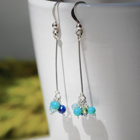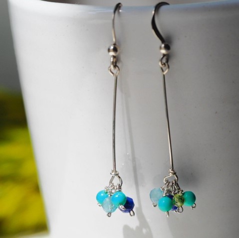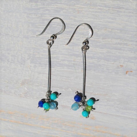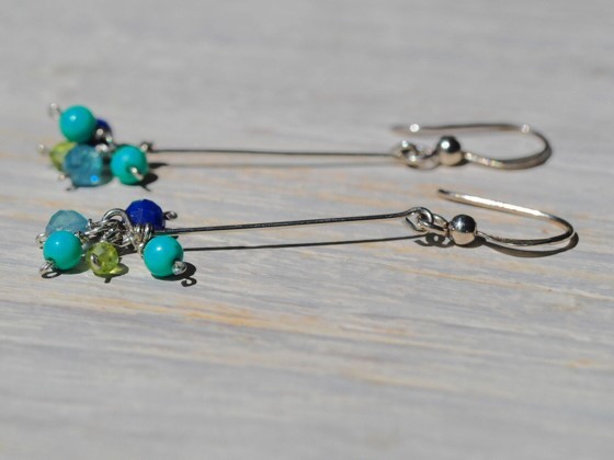 濃淡のある小粒ラウンドトルコ石、ラウンドカットのアクアマリン、ラピスラズリー、ペリドットのピアスです。