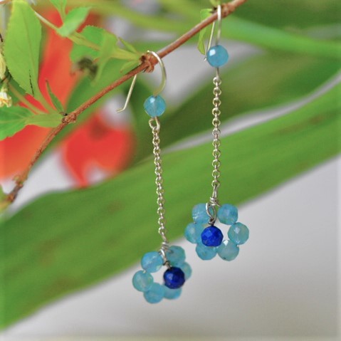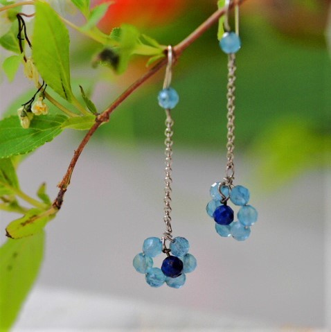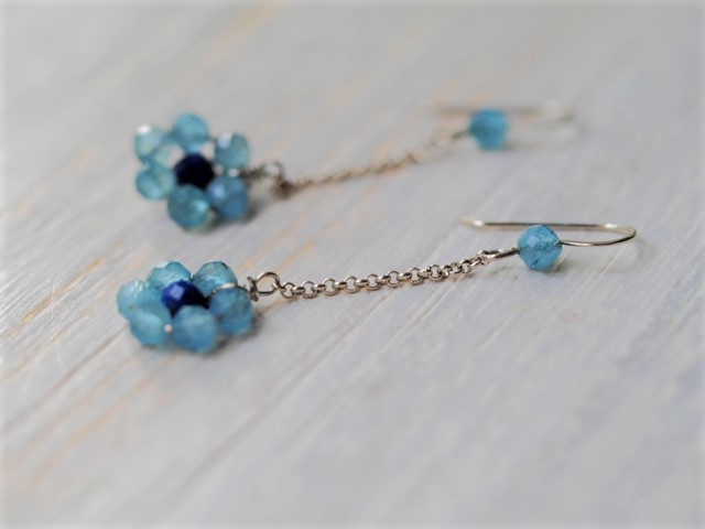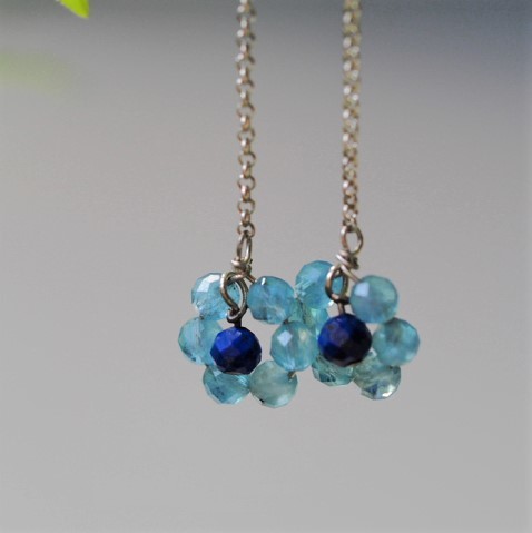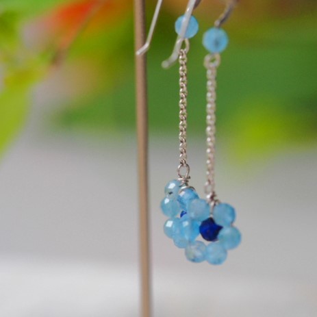 アクアマリンにラピスラズリを花芯に見立てた揺れるブルー系のピアスです。