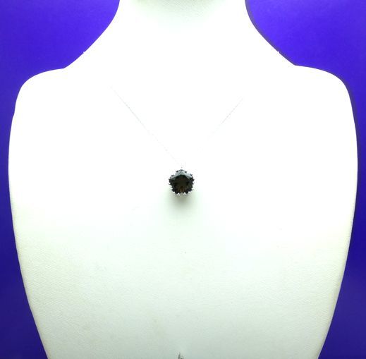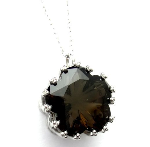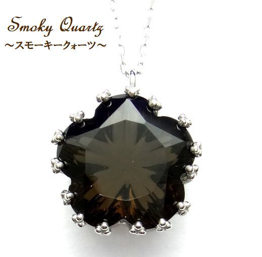 K10WG スモーキークォーツ 4ctアップ フラワー ペンダント ネックレス 40cm クラウン 王冠 ジュエリー 煙水晶 ホワイトゴールド 箱付き