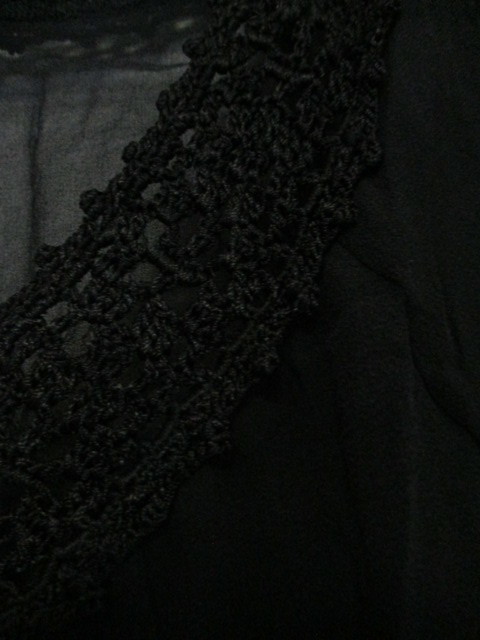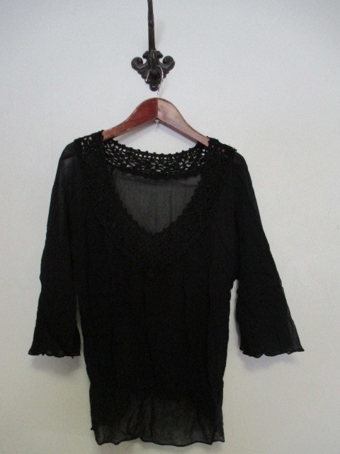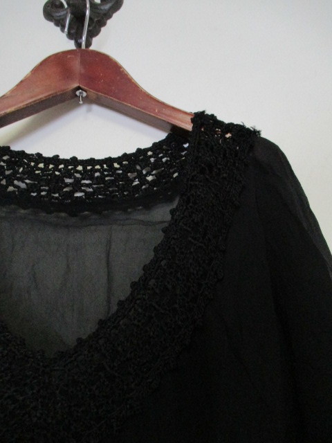 | 商品紹介 | シルクシフォン素材を使った透け感のあるブラウスです。 衿周りのかぎ針編みがデザインのポイントになっています。 袖は7分で、Aラインになっています。 裾近くにゴムでギャザーが入った形です。 色は黒です。 《素材》 表地:シルク100% かぎ針:レーヨン100% |