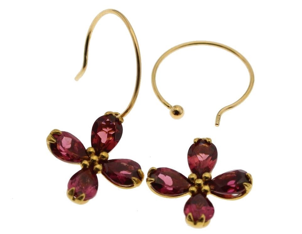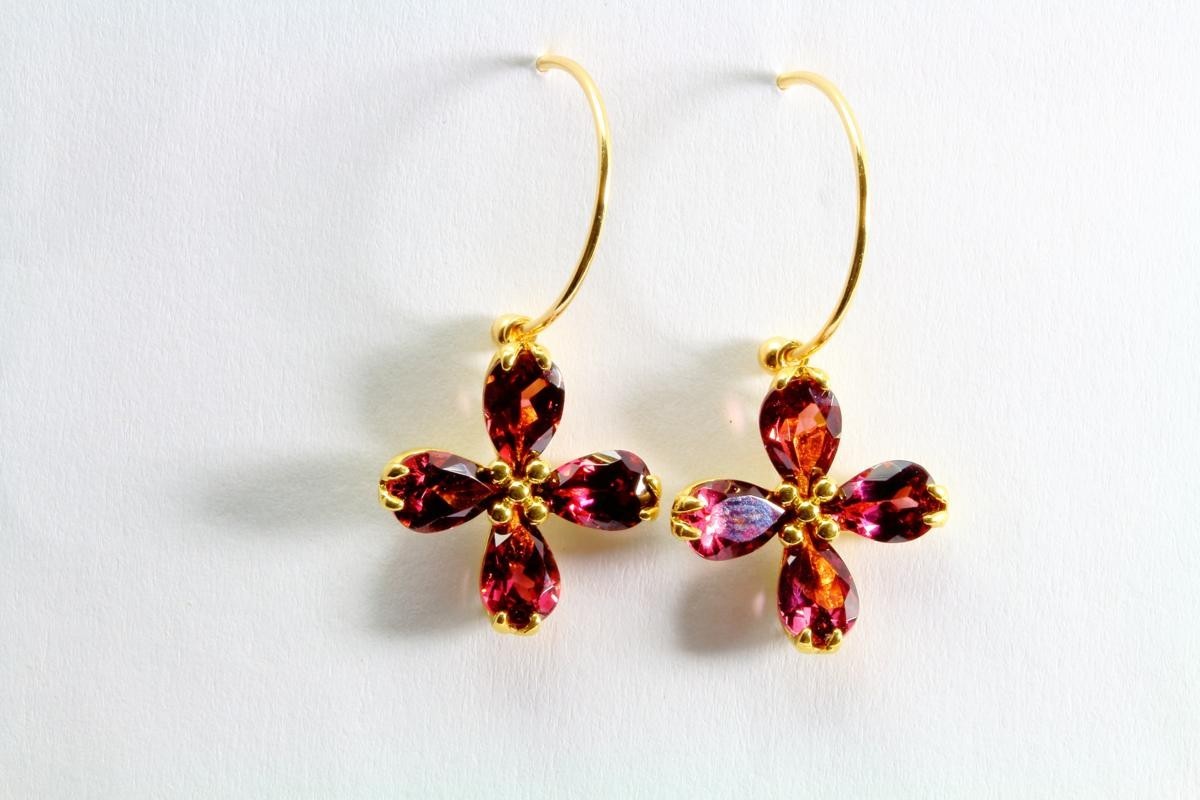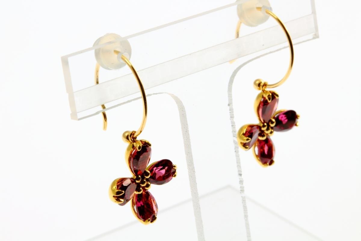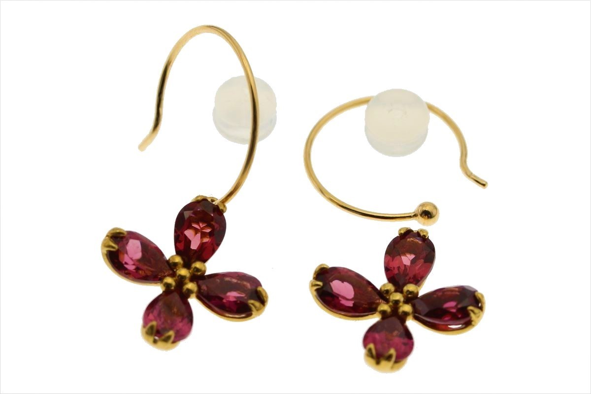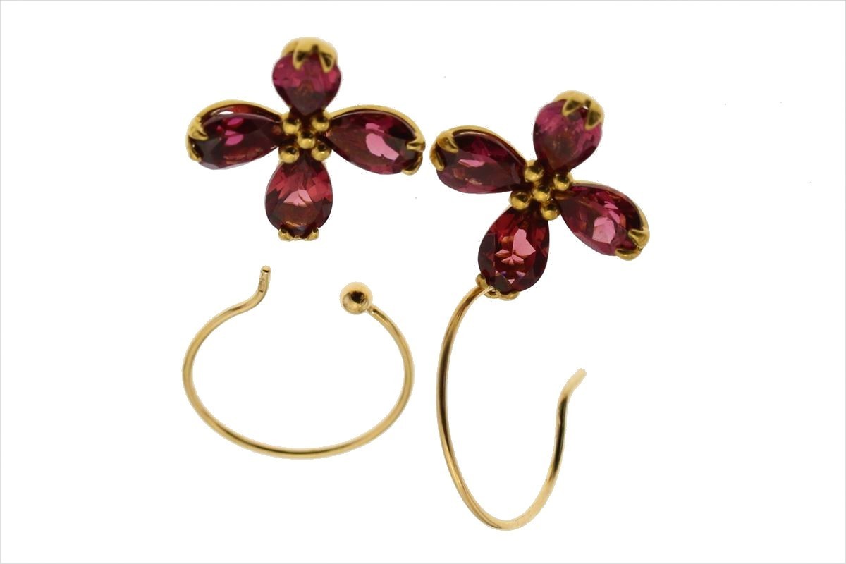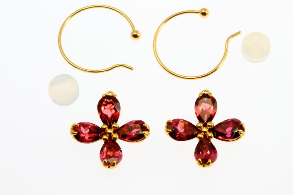 四つ葉フラワーモチーフガーネットフックピアスK18 取り外し可能